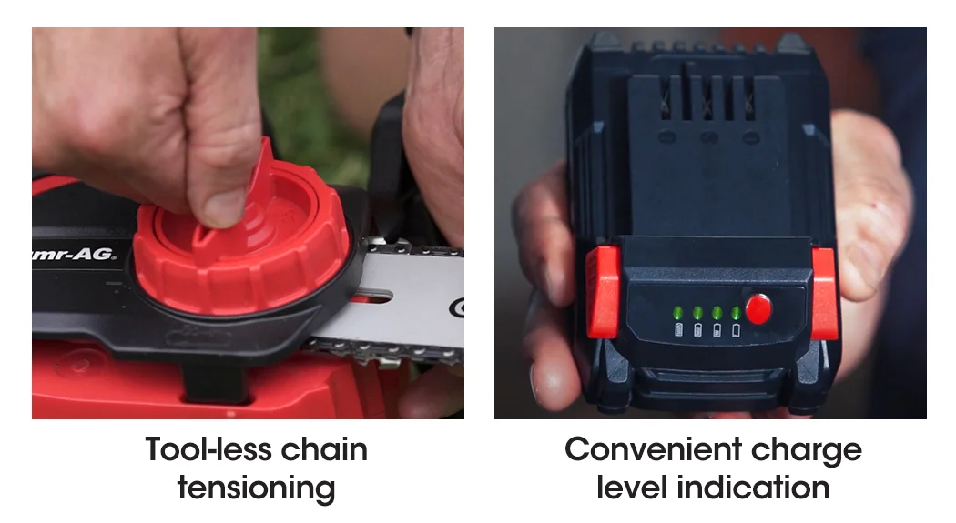 Baumr-AG continues to deliver innovative gardening tools with the SYNC series SW3 Lithium-Ion Chainsaw. Powered by a 20V lithium-ion battery, this cordless tool brings the power and longevity you need to tame the outdoors without the fumes. Baumr-AG has utilised a genuine OREGON® 10” chain and bar to provide unrestricted quality, so you can cut in total confidence. Furthermore, its auto-oil-lubrication function prevents the chainsaw from running dry, and you can always monitor your levels thanks to the convenient oil level window positioned on the side of the unit.