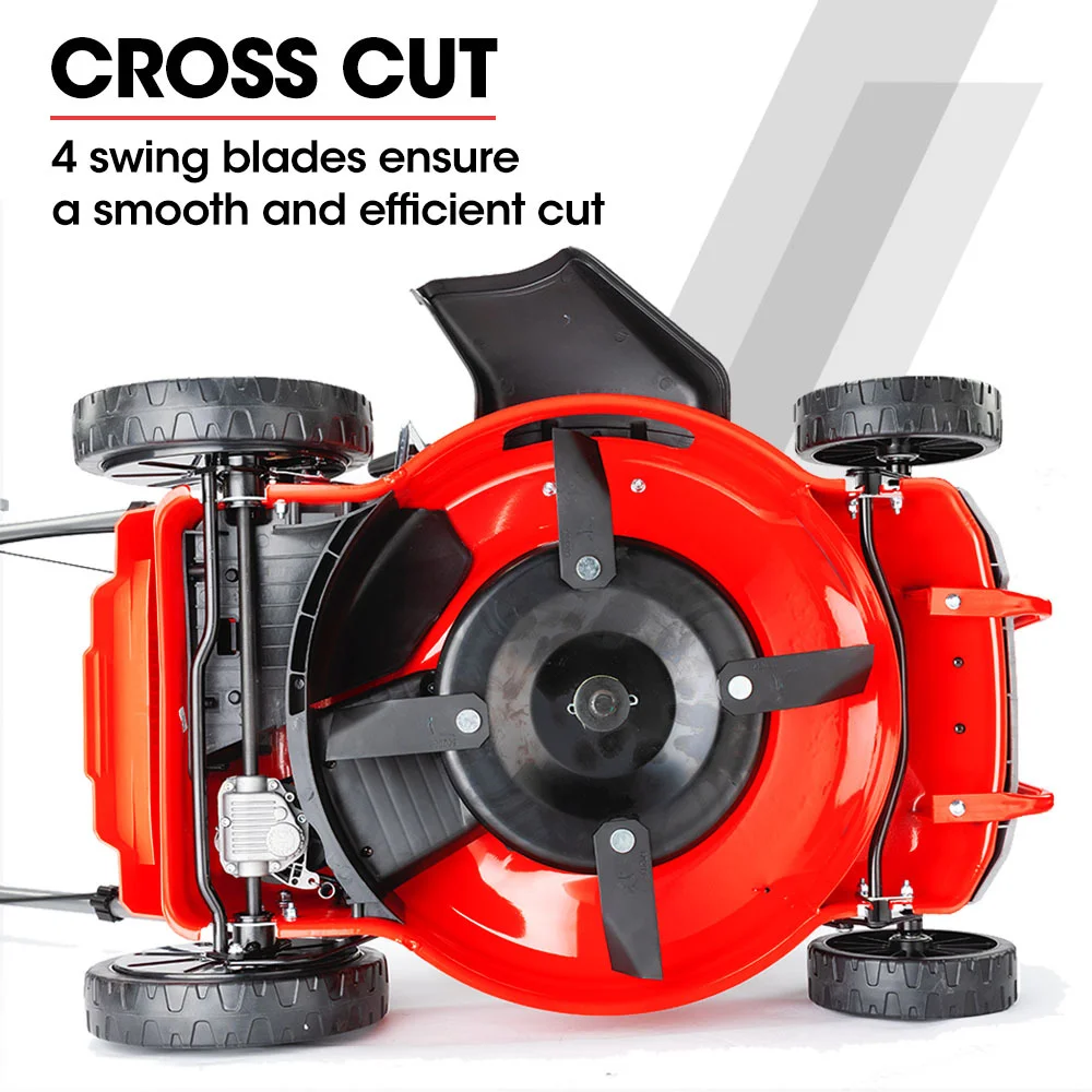The absolute world class quality is complemented by all the features you need; 7 Stage central height adjustment, a heavy-duty 20' steel deck, an integrated drink holder and quick release folding handles. 4-in-1 functionality offers the option of catching, mulching, direct side discharge or direct rear discharge, while the self-propelled design ensures a leisurely stroll. And with CrossCut swing blades you'll always end with a perfectly cut lawn that your neighbours will envy!