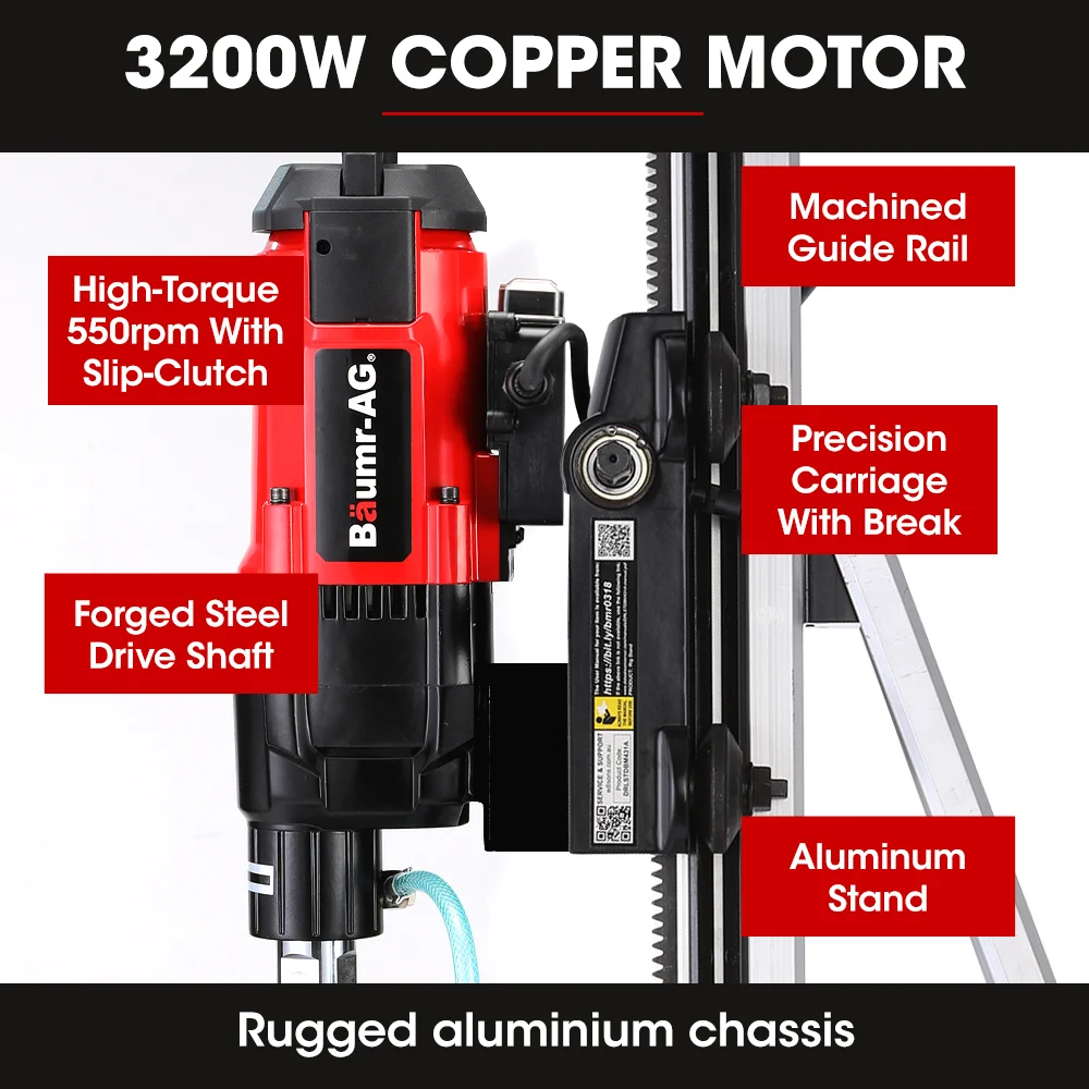 With a heavy-duty 3200W motor, the Baumr-AG wet core drill offers relentless power, letting you tackle any project. Experience the highest reliability with the copper motor. A built-in slip-clutch system that delivers maximum power and protects the machine from overloading and sudden seizing, guaranteeing consistent performance. Combined with its no-load speed of 550r/min, this machine conquers even the toughest materials, leaving no room for compromise.