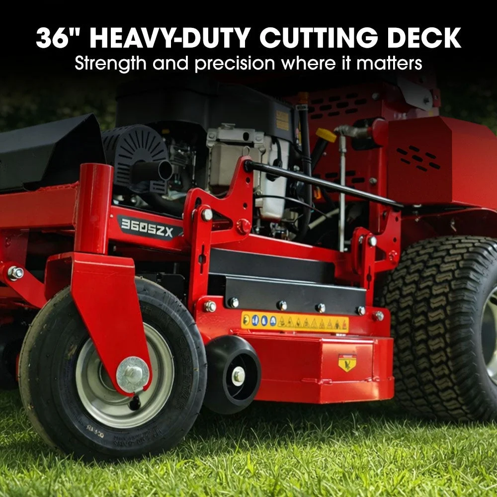 At the heart of the 360SZX is a Loncin LC2P80F 23HP V twin engine with 764cc displacement. Air cooled efficiency supports steady operation, while electric start delivers reliable run ups for daily use in tough mowing conditions.