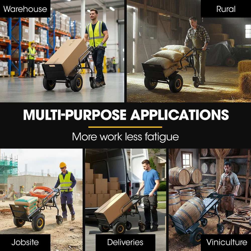 Built around a robust steel and aluminium frame, the BTR-1000e features adjustable support rails from 590mm to 910mm to suit bulky or awkward loads. Large pneumatic tyres improve traction and stability across gravel, kerbs and uneven ground.