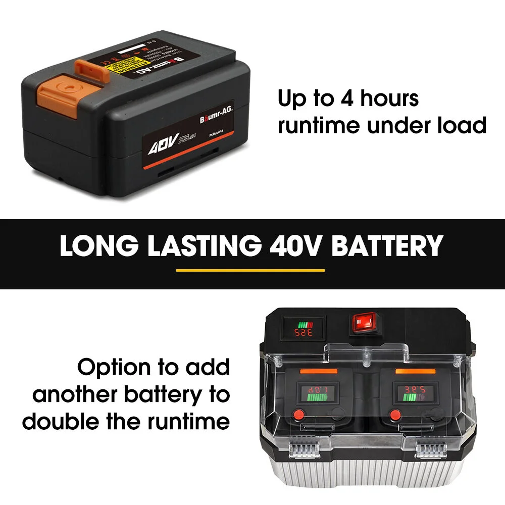 Powered by a 40V 7.5Ah lithium battery, it delivers up to 4 hours of typical runtime and recharges in under 4 hours. The battery compartment can accommodate two batteries, allowing you to manually switch over to a spare for an even longer runtime. With IP54-rated protection and a foldable design for transport and storage, it's a practical, hard-working solution for everyday heavy lifting.