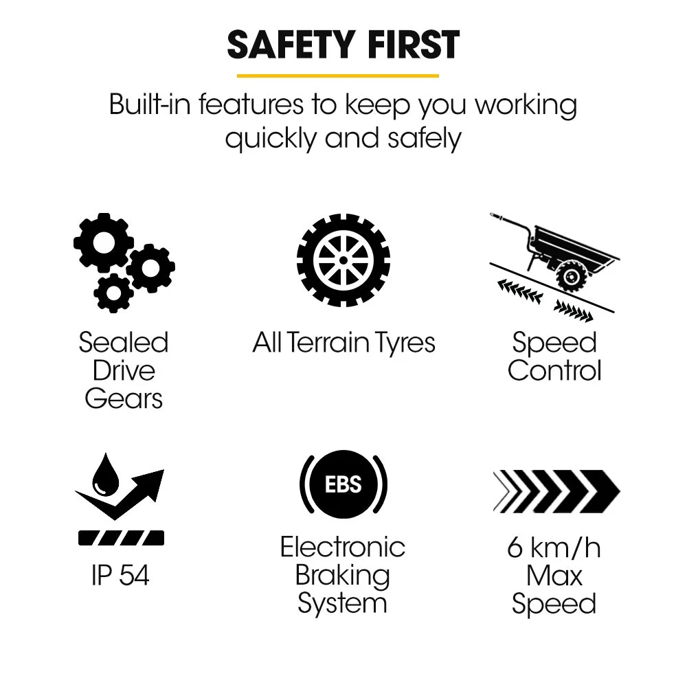 Large pneumatic tyres improve traction across dirt, gravel and uneven ground, helping reduce operator fatigue while maintaining stability. Powered by a removable lithium battery with weather-resistant protection, the BPR-1100e is a practical, hardworking solution designed to move more with less effort, day after day.