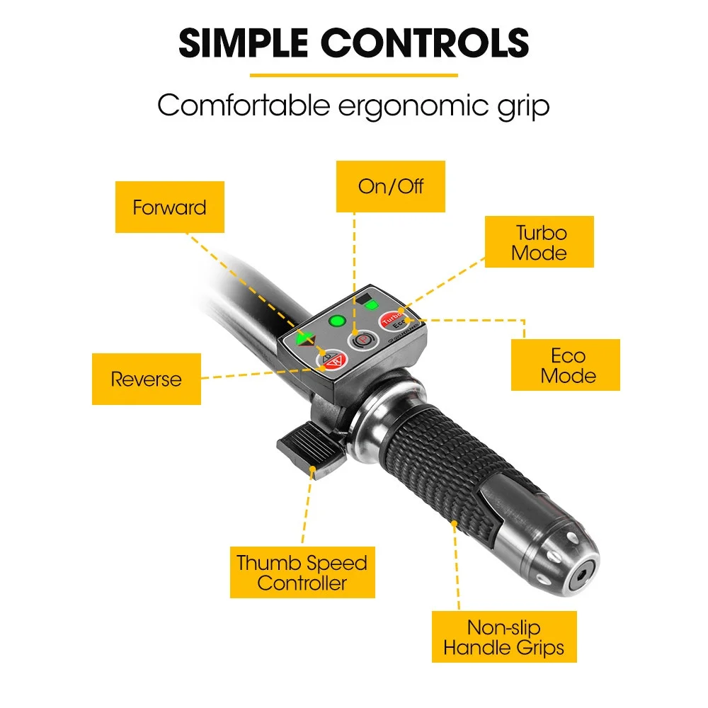 Powered by a smooth and efficient brushless motor, the front-wheel drive system provides controlled, consistent assistance exactly when you need it. Variable speed operation allows you to match pace to the task, while the electronic braking system ensures smooth, predictable stopping for confident operation when working on hills.
