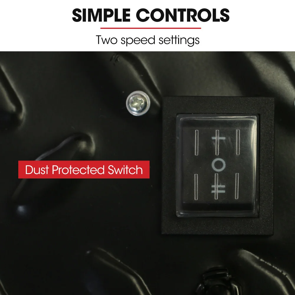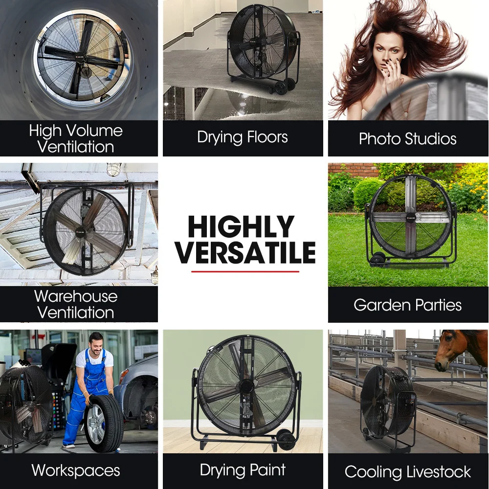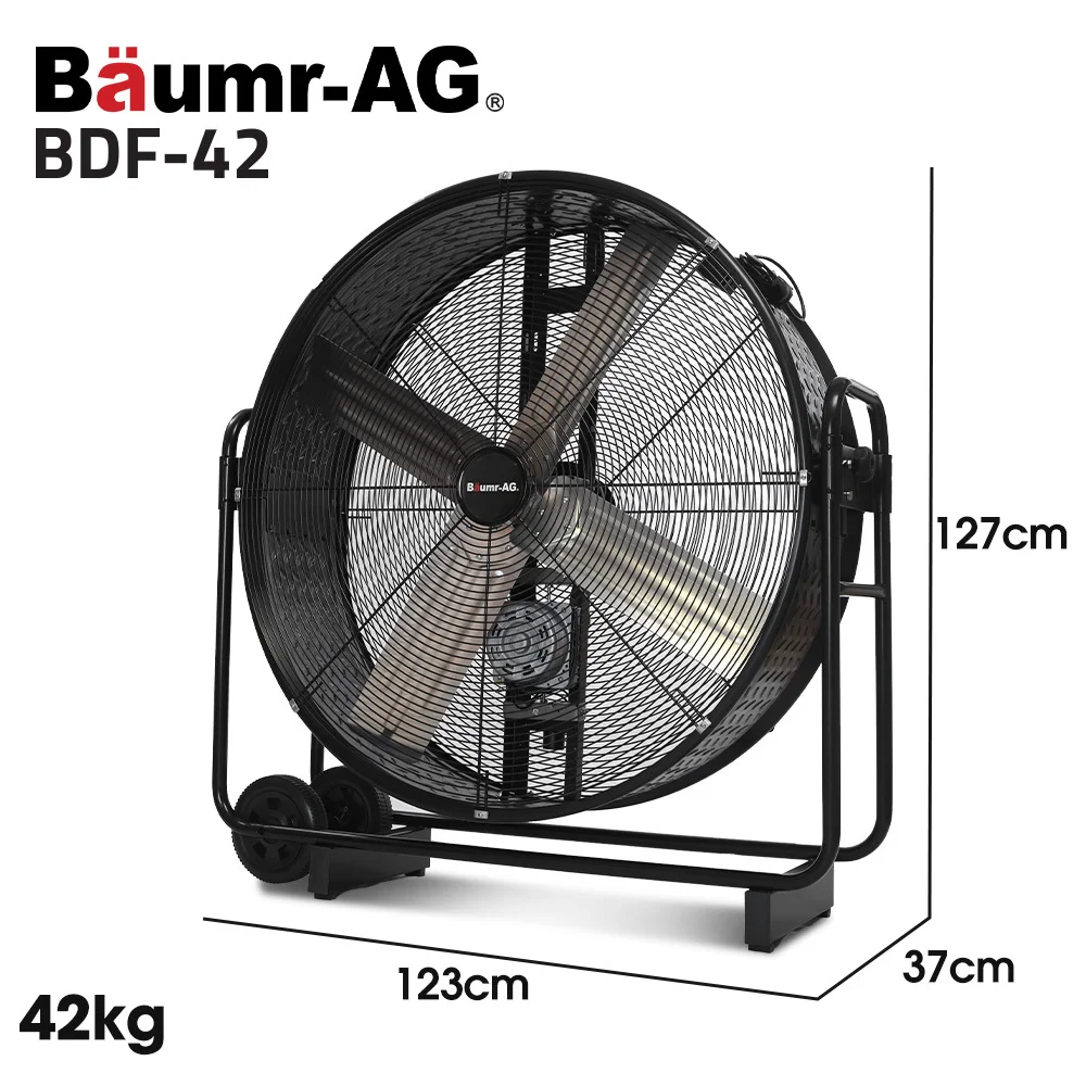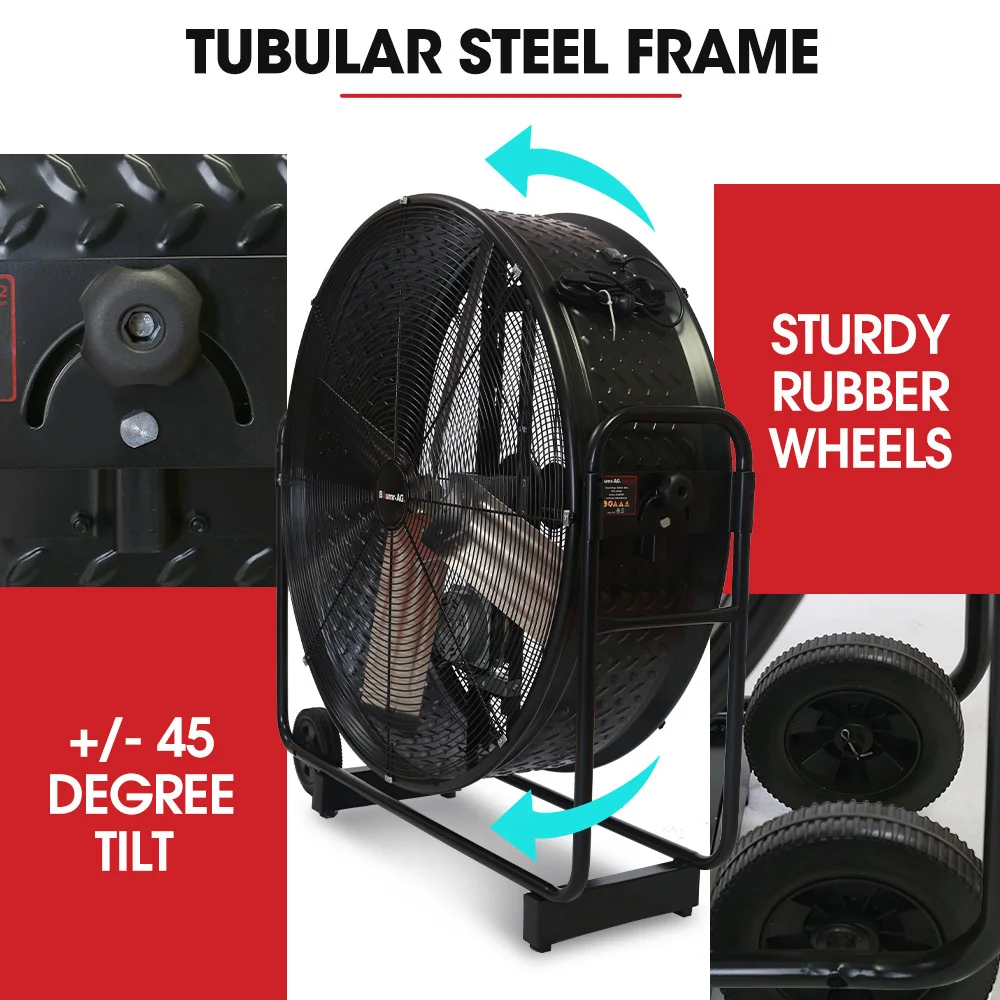 The heavy-duty all-metal construction with powder-coated diamond plate steel drum offers long-lasting durability and corrosion resistance. The aluminium blades are designed to handle tough conditions while providing smooth and efficient airflow. The chrome steel guard and frame ensure extra protection and stability.