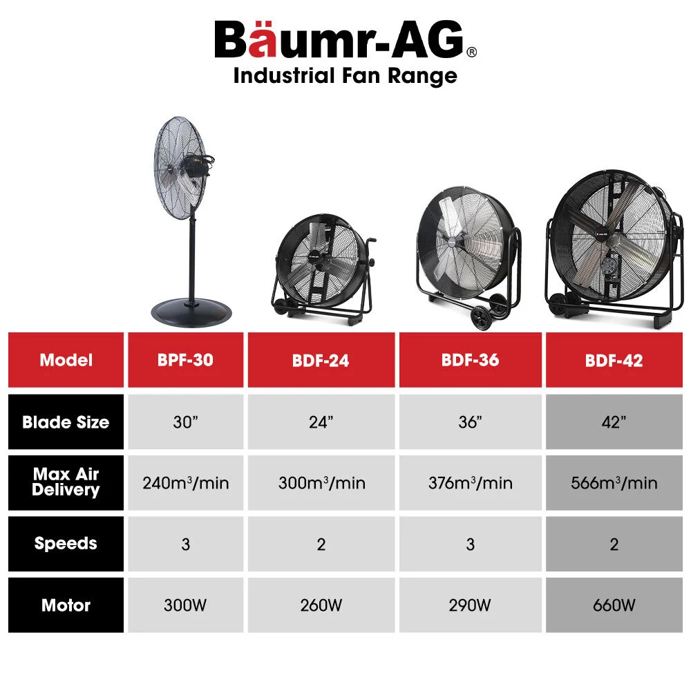 Equipped with a 660W motor, the Baumr-AG 42” Industrial Drum Fan delivers high-powered airflow for large spaces. With 2 variable speed settings, you can easily adjust to suit your ventilation needs. The fan provides an impressive max air delivery of 566cubic metres per minute, ensuring powerful cooling in workshops, warehouses, or other industrial environments.