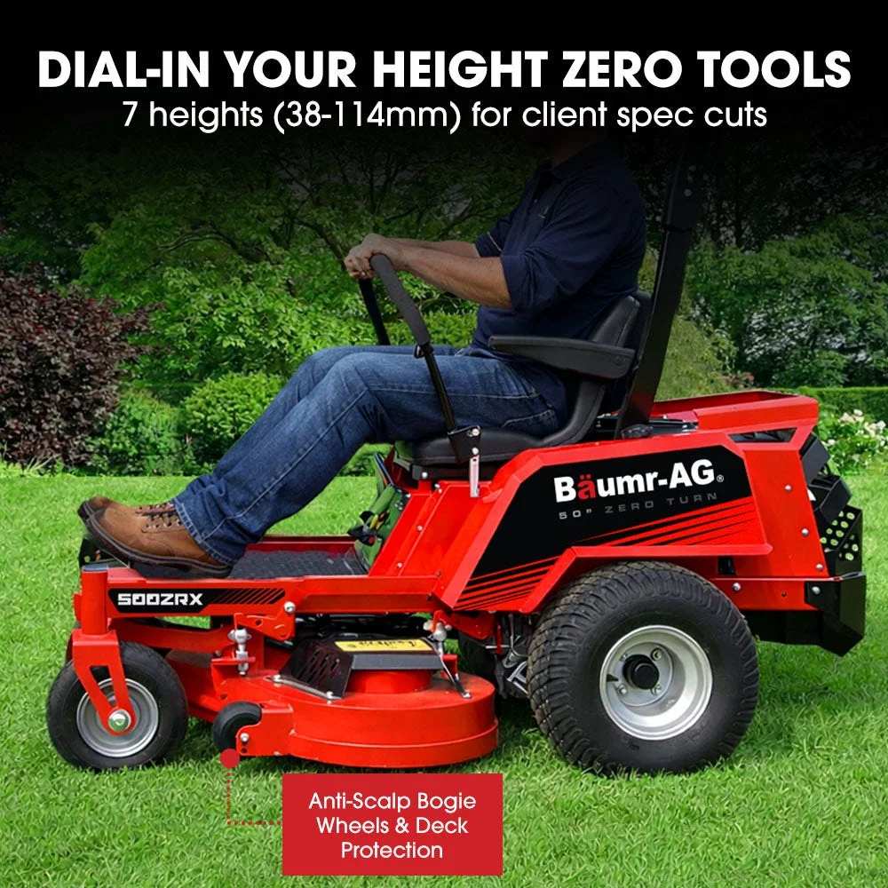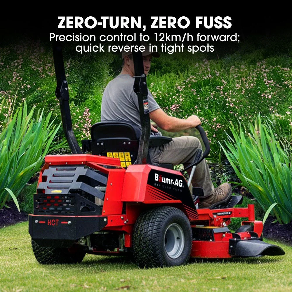 The Baumr AG 500ZRX zero-turn ride-on mower is engineered for fast, efficient mowing across large lawns and properties. Its wide cutting deck and responsive handling help you cover more ground with less effort.