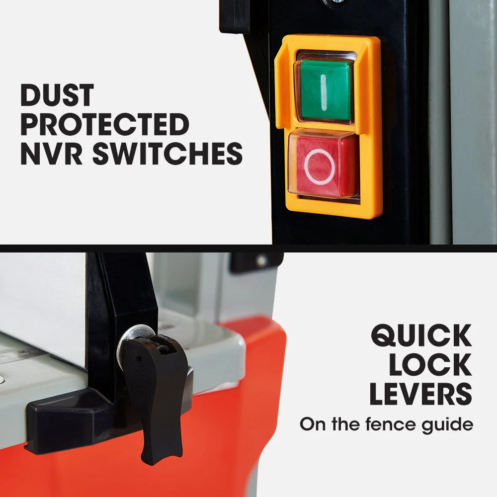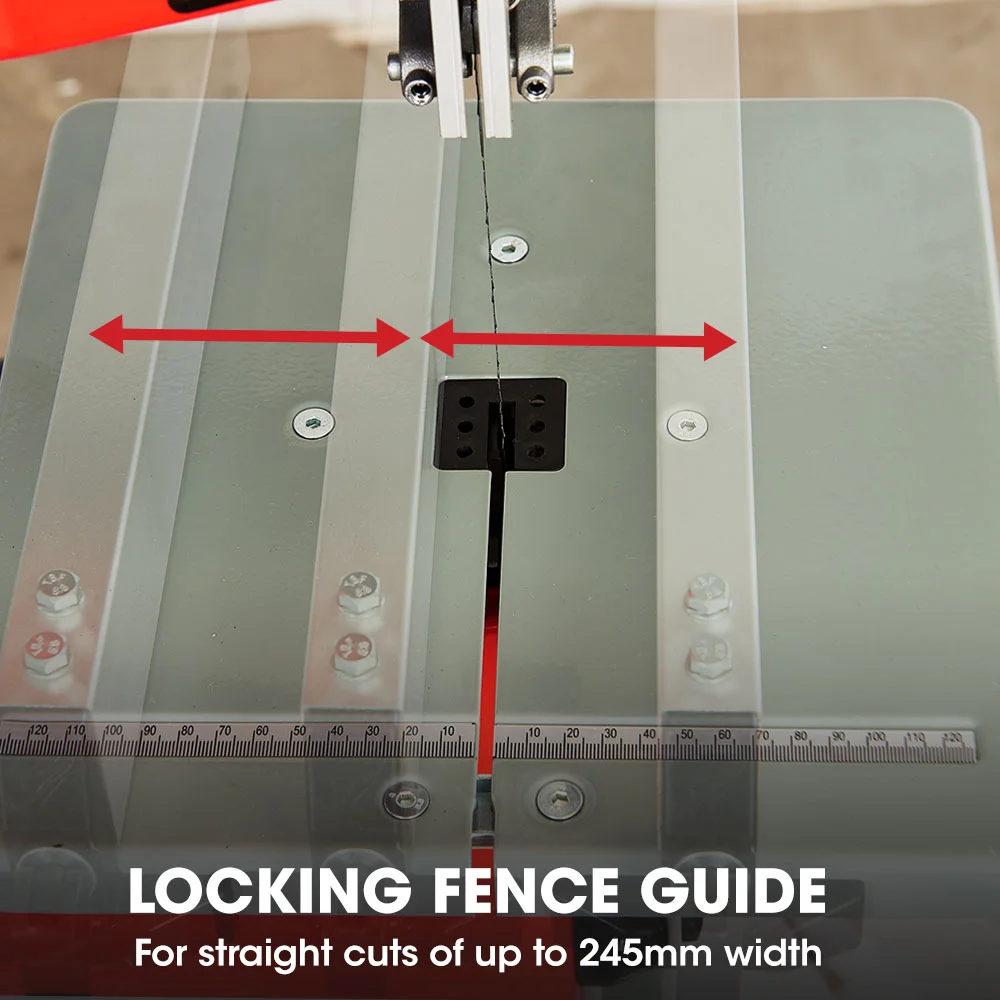 To accommodate bevel cuts, the BS40 features a 0 to 45 degree angle tool-less adjustable table with precise scale. Built for fast, chip and wobble-free cutting, the BS40 delivers an impressive 245mm maximum cutting width and up to 115mm cutting height. It comes complete with dust protected switches, a precision mitre guide on the large work table for accurate results, and a quick-lock clamp locking fence system for clean straight cuts.