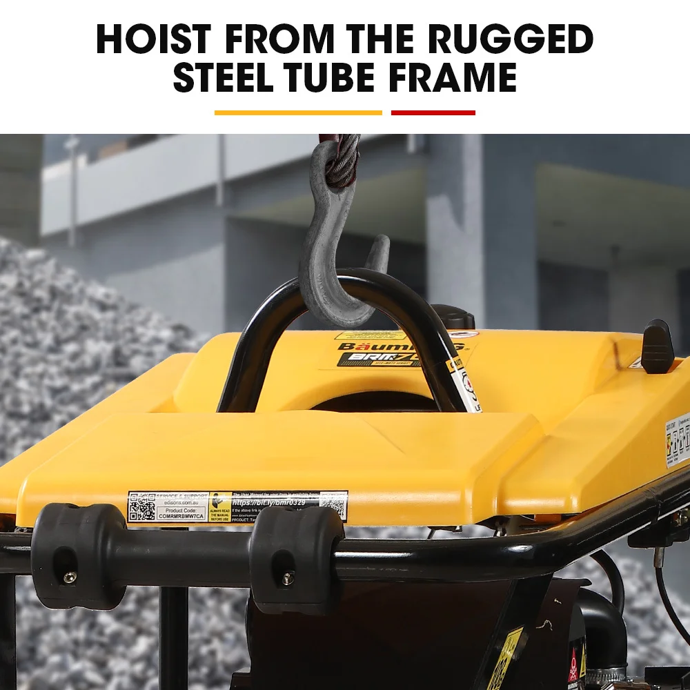 You'll get the job done fast with a large 285 x 345mm shoe that advances at 10-13 metres per minute, plus, the 2.8-litre tank which ensures less frequent refuelling. The high performance engine is protected by a rugged steel tube frame that has a convenient central hook point. User vibration is minimised significantly by heavy duty rubber handle mounts. And that's not all, a bonus transport wheel kit that clips on in seconds is included for easy moving around the job site!