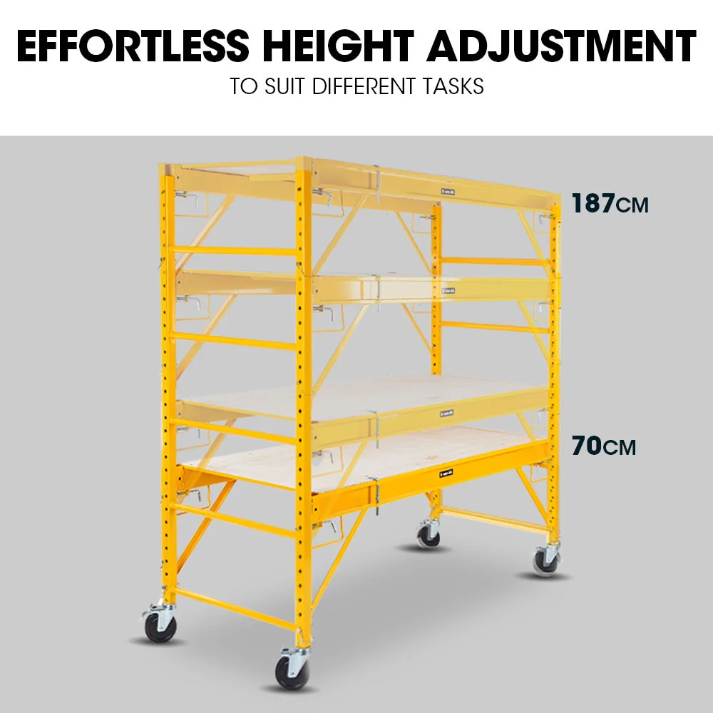 Elevate your work to the next level with the Baumr-AG Mobile Adjustable Scaffold with Trap Door. This heavy-duty powder coated steel unit has been designed to provide the safest and easiest solution to raising your working height. In fact, this unit has been designed so that it can be effortlessly assembled and adjusted by a single person working on their own. This is largely thanks to the fast and secure pin loaded platform lock system, allowing users to incrementally raise and lower the work platform between 70cm and 187cm. The scaffold comes equipped with a trap door hatch for easy, convenient access.