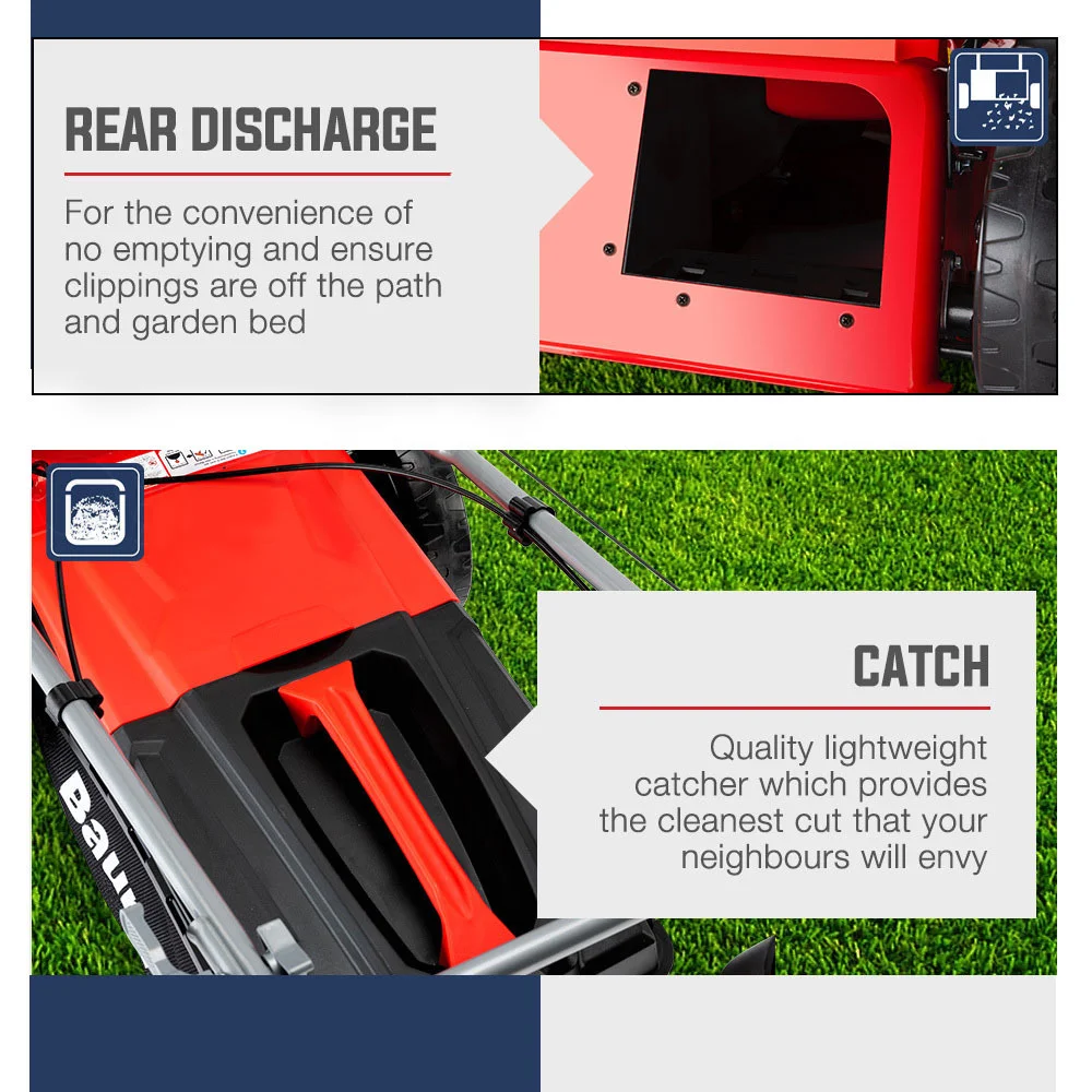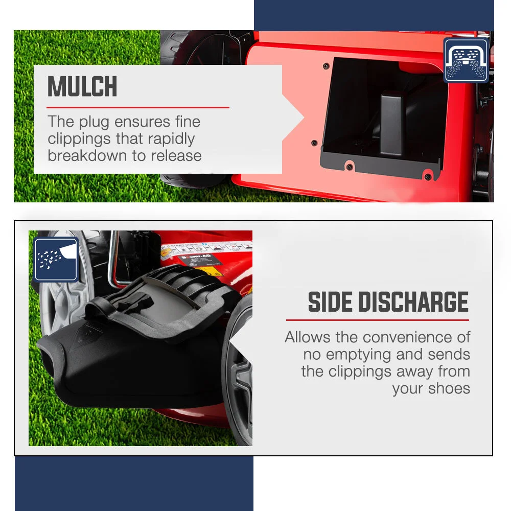 The 780SX lawn mower boasts high quality components which includes advanced four-stroke OHV technology that blends a high power output with easy starting and efficiency. The large and effortlessly powerful air cooled 220cc engine slices through the toughest buffalo with ease.