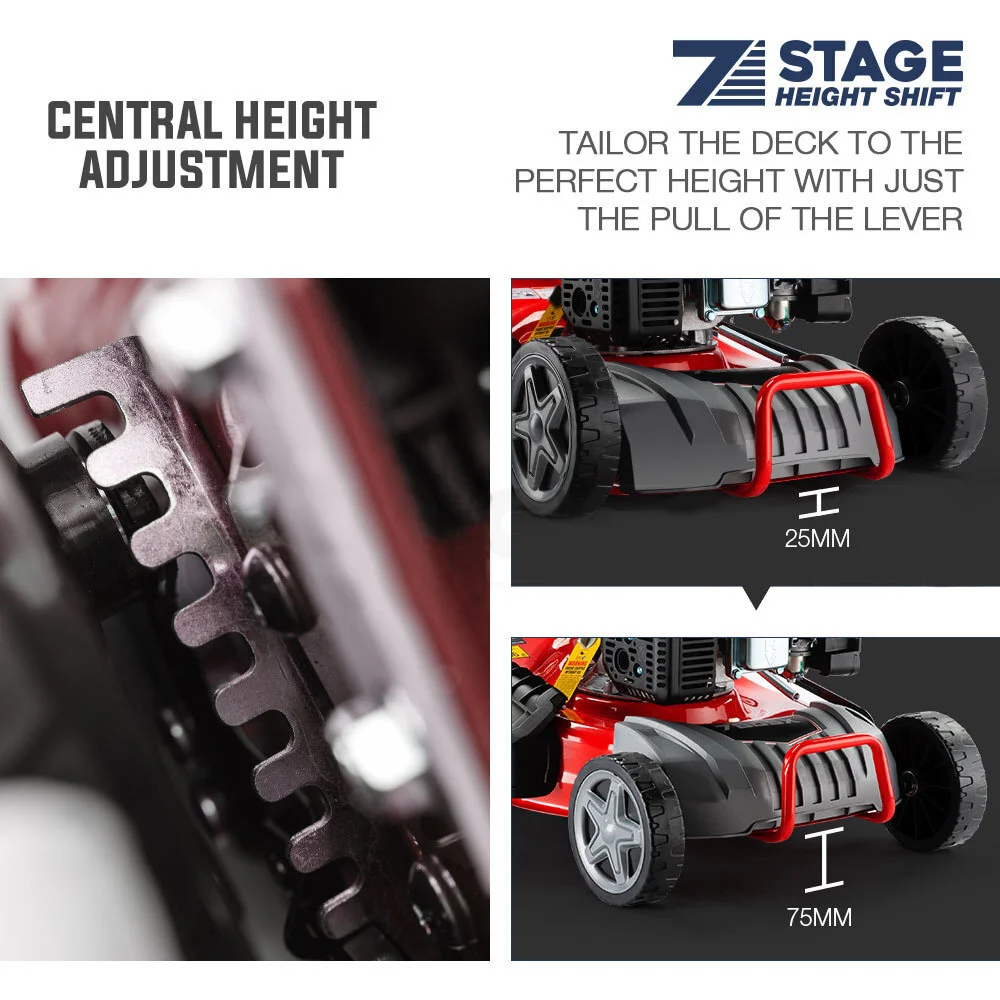 The absolute world class quality is complemented by all the features you need; 7 Stage central height adjustment, a heavy-duty 18" steel deck, an integrated drink holder and quick release folding handles. 4-in-1 functionality offers the option of catching, mulching, direct side discharge or direct rear discharge, while the self-propelled design ensures a leisurely stroll. And with CrossCut swing blades you'll always end with a perfectly cut lawn that your neighbours will envy!