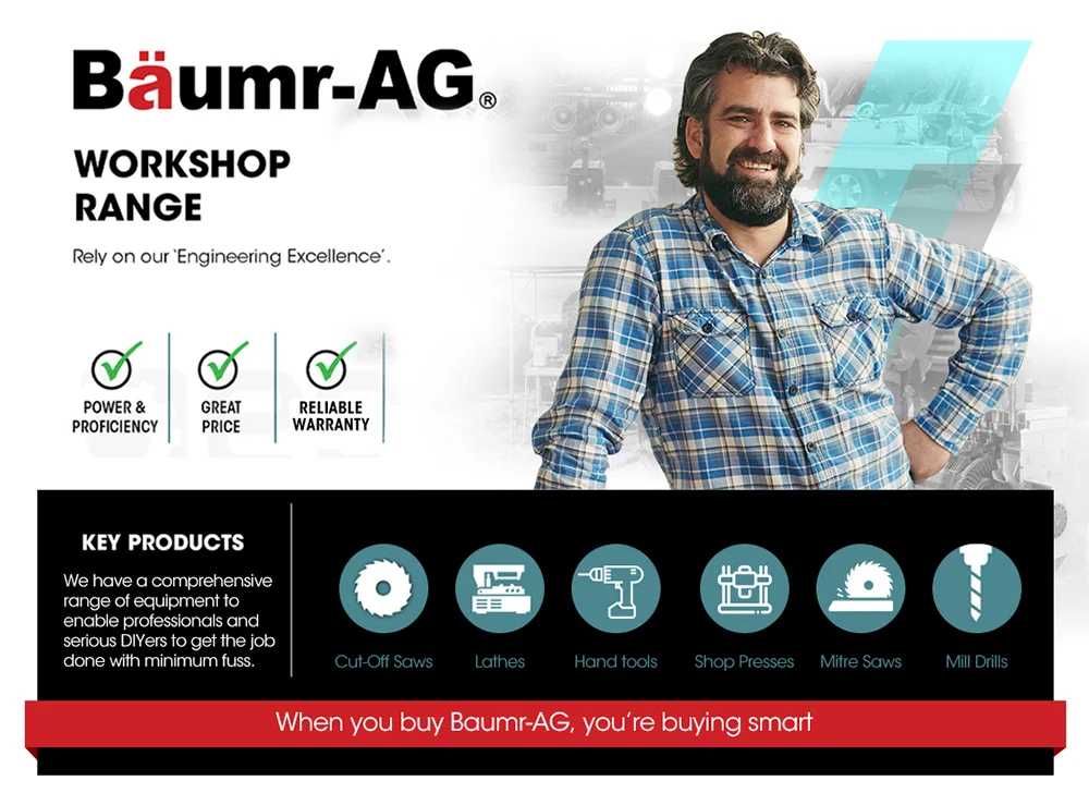 The clever 2-in-1 design includes a benchtop stand which enables you to perform the functions of a Metal Cut-off saw. Workpieces are easily secured in the quick-adjust vice clamp, and precise cuts including mitres can be made using the onboard scale. As an added benefit, unlike a traditional chop saw the Baumr-AG slices through metal with no sparks, and is cool to touch after the cut!