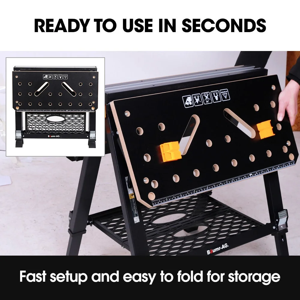 Switch seamlessly between a sturdy work table and a heavy-duty sawhorse. Support up to 100kg in workbench mode or a massive 454kg in sawhorse mode with the sides folded down.