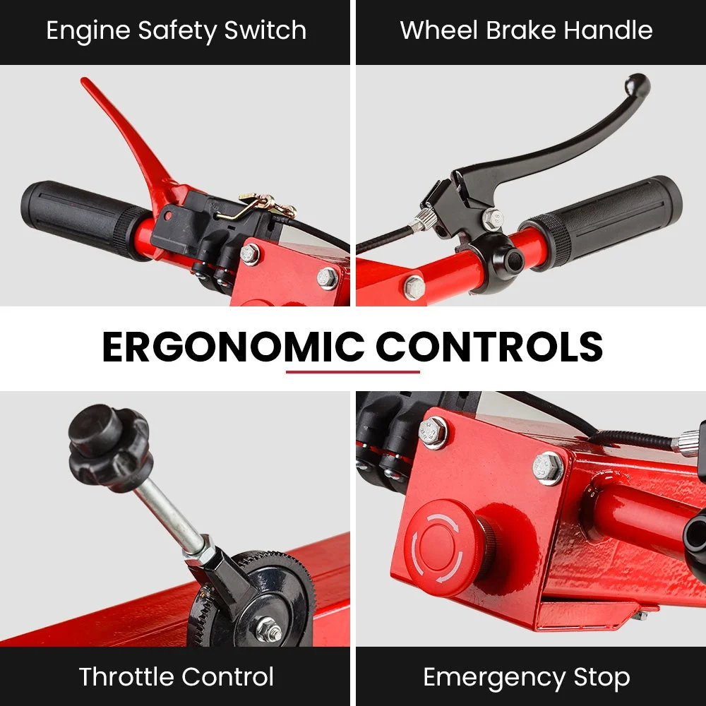 Known for their practical and innovative designs, Baumr-AG has once again exceeded industry standards. The powerful TRN660 has an 8HP 4-stroke OHV engine, with forced air-cooled performance and trenching speeds of up to 60 metres per hour. Starting is a breeze with an easy-to-pull recoil start. Convenient controls—throttle lever, stop switch, emergency stop, and lever-activated wheel lock—are on the handlebars for easy and safe operation.