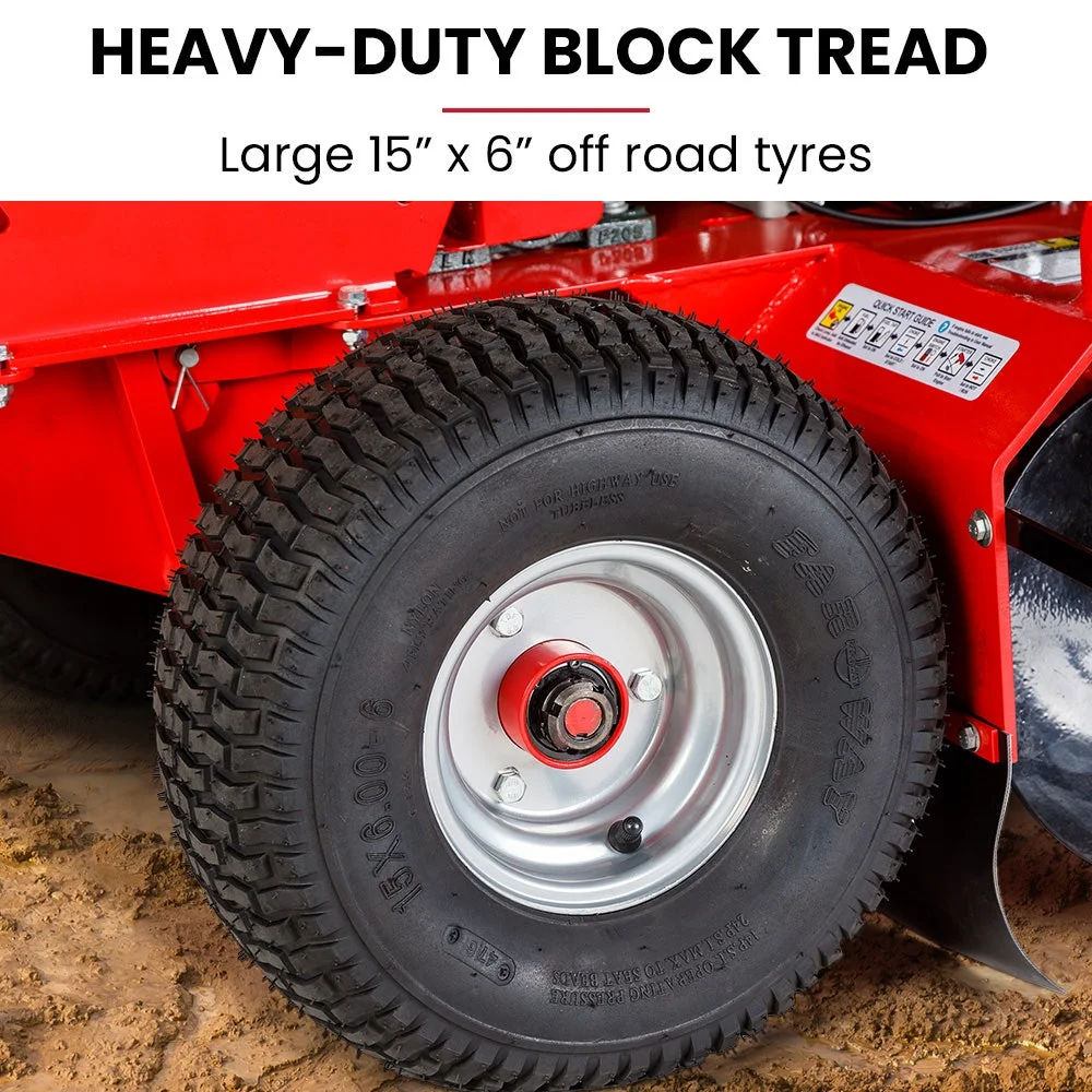 Baumr-AG has engineered this trencher with premium components. The tungsten carbide digging teeth are mounted on a heavy-duty chain. They are driven by a hardened steel rear sprocket. The centrifugal clutch and adjustable throttle digging system prevent over-torque and machine kicking. The front and rear grease nipples are great for easy maintenance of machine components. The XL 15" x 6" extra-wide all-terrain tyres handle rough terrain effortlessly.