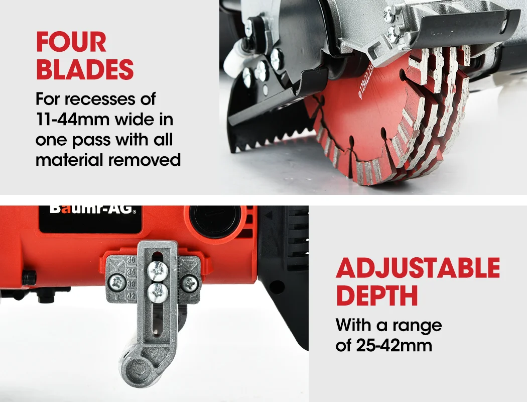 Unlike traditional models with just two blades, Baumr-AG Wall Chasers ensure that any breakout is a quick and easy step. The blades themselves are quick to change, and channels between 25-44mm are possible with different combinations of the blades and spacers.