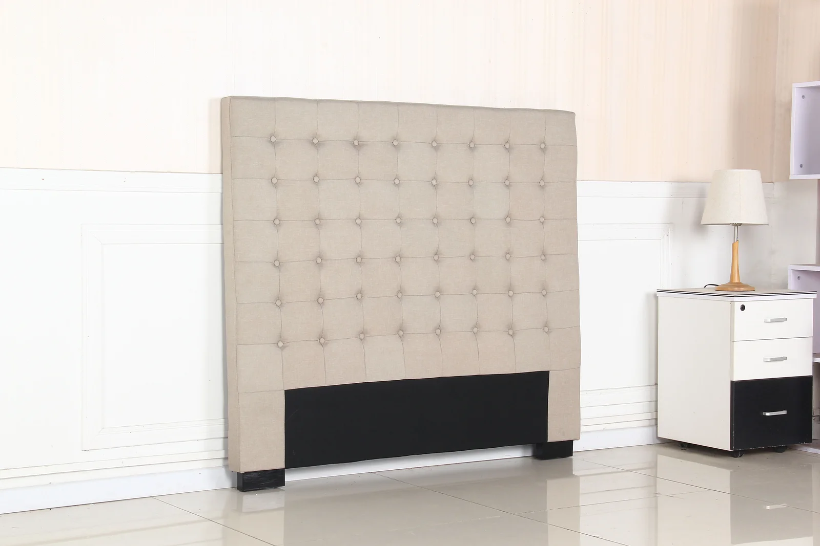 The headboard is finely decorated with seamed grid pattern and fabric covered buttons on high padded surface. It provides a backrest for the persons who want to sit up and read. Accented by numerous buttons in a tufted fashion, this headboard would evoke a sense of grace and elegance.