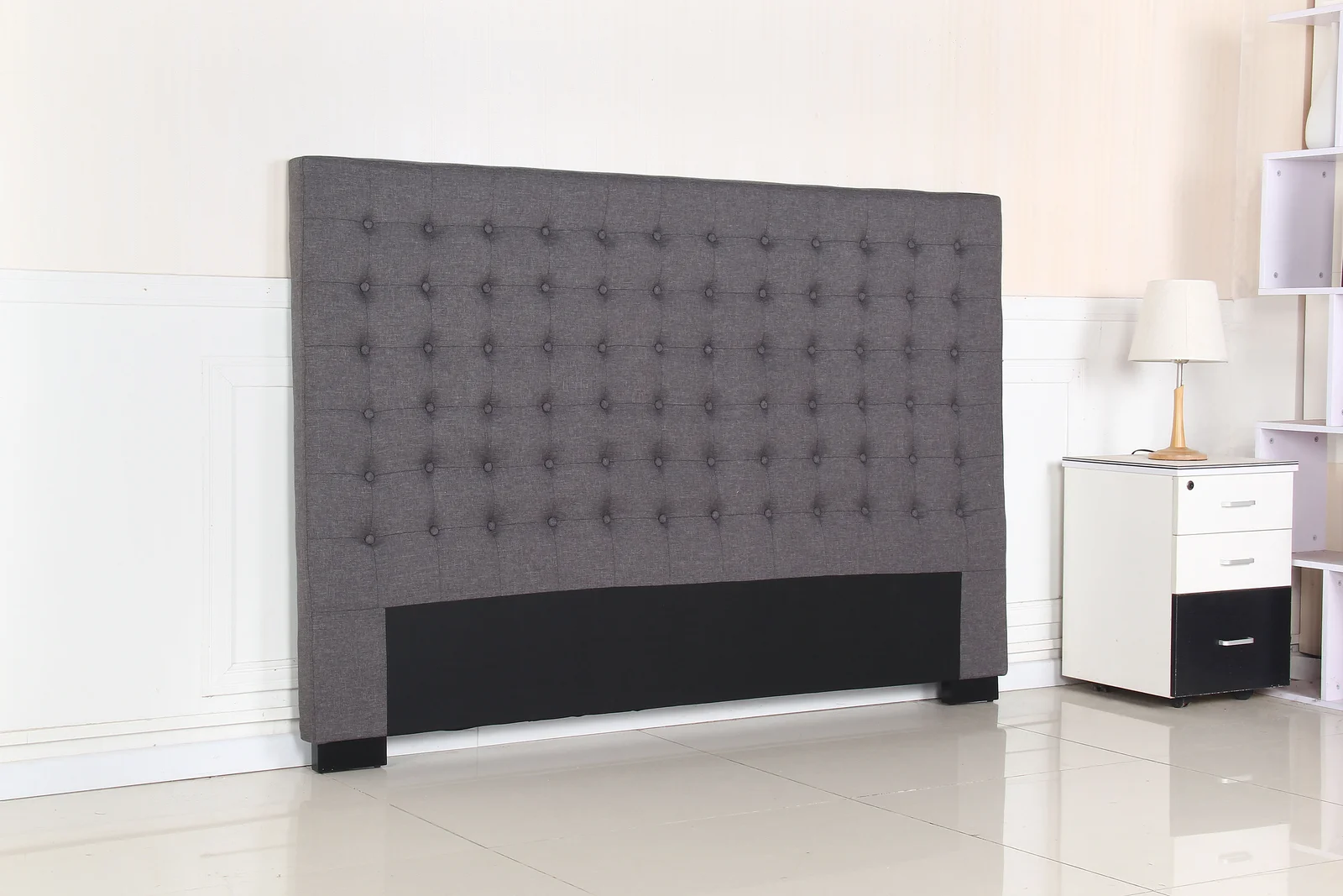 The headboard is finely decorated with seamed grid pattern and fabric covered buttons on high padded surface. It provides a backrest for the persons who want to sit up and read. Accented by numerous buttons in a tufted fashion, this headboard would evoke a sense of grace and elegance.