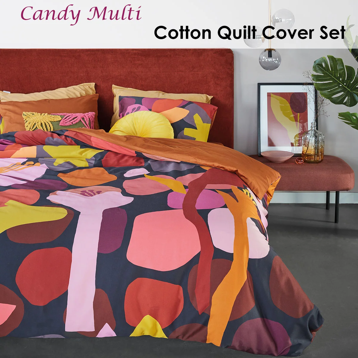 Brighten up your bedroom with the Candy Multi Cotton Sateen Quilt Cover Set by Bedding House. The design features a contemporary digital print of hand-cut flowers and leaves in a variety of warm colours of orange, pink, white, black, white, red, and mauve, and purple. The trendy cover has an elegant shine thanks to its satin weave. The back of the duvet cover is terracotta.