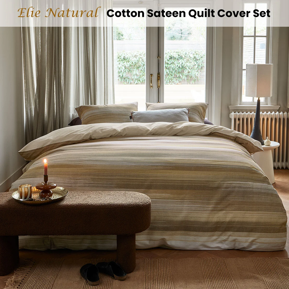 The Elie Natural Cotton Sateen Quilt Cover Set by Bedding House combines a modern design with a cosy appearance. The abstract horizontal stripes in warm taupe, brown, and yellow tones, along with the subtle ikat weave structure, create a luxurious and trendy look. The solid reverse side offers versatility in styling, making it ideal for various interiors. Made from smooth cotton sateen, it offers breathable and comfort, and a luxurious touch for everyday indulgence.