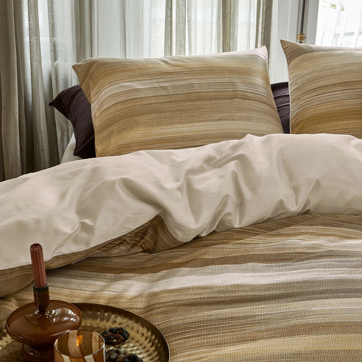 The Elie Natural Cotton Sateen Quilt Cover Set by Bedding House combines a modern design with a cosy appearance. The abstract horizontal stripes in warm taupe, brown, and yellow tones, along with the subtle ikat weave structure, create a luxurious and trendy look. The solid reverse side offers versatility in styling, making it ideal for various interiors. Made from smooth cotton sateen, it offers breathable and comfort, and a luxurious touch for everyday indulgence.