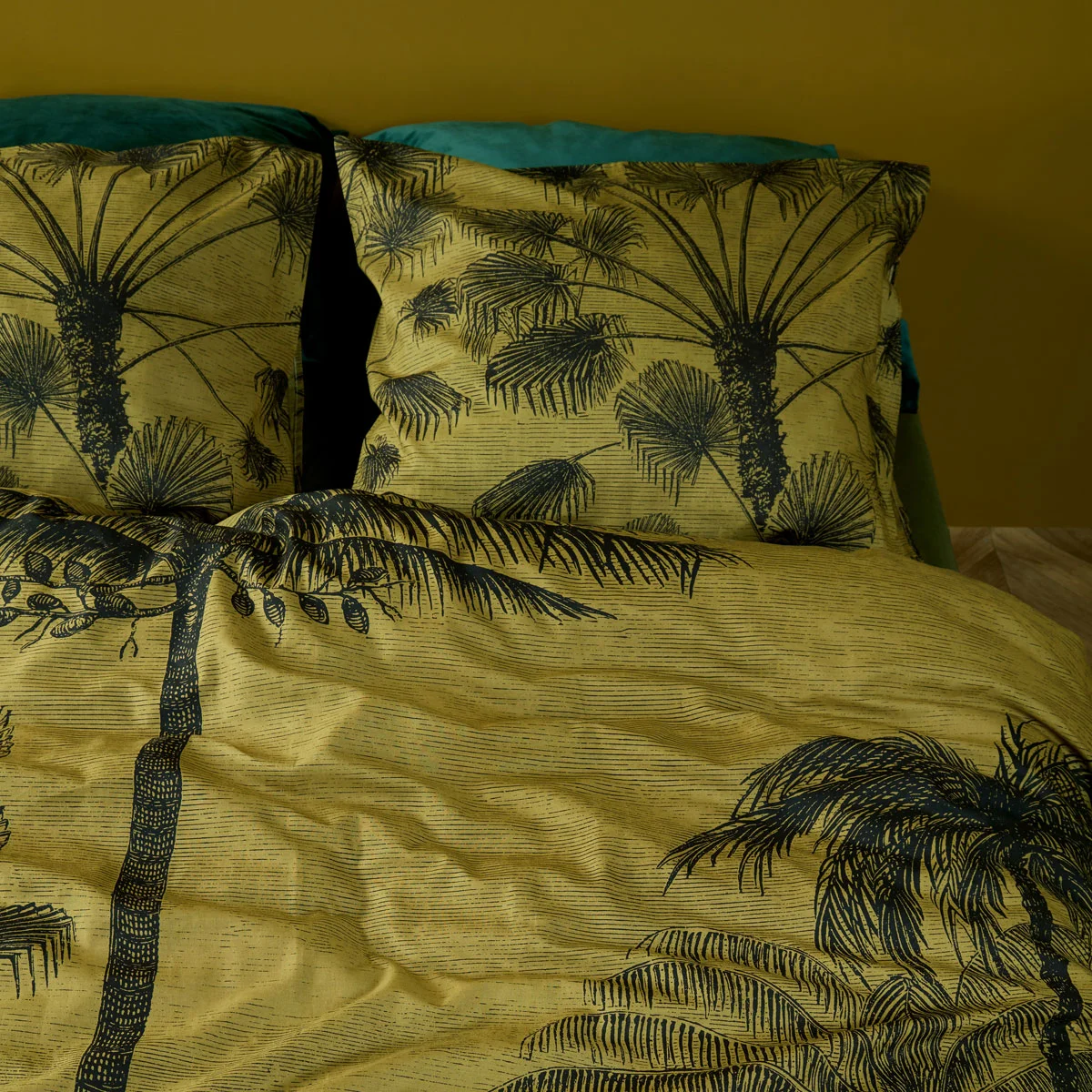 The Tour du Monde Ochre Cotton Quilt Cover Set by Bedding House has a black line drawing of a beautiful botanical landscape featuring a variety of palms. The printed black line drawing stands out particularly well against the gold background. Tour du Monde is a work of art for every bed. It is made from high quality and soft touch 100% Cotton fabric.