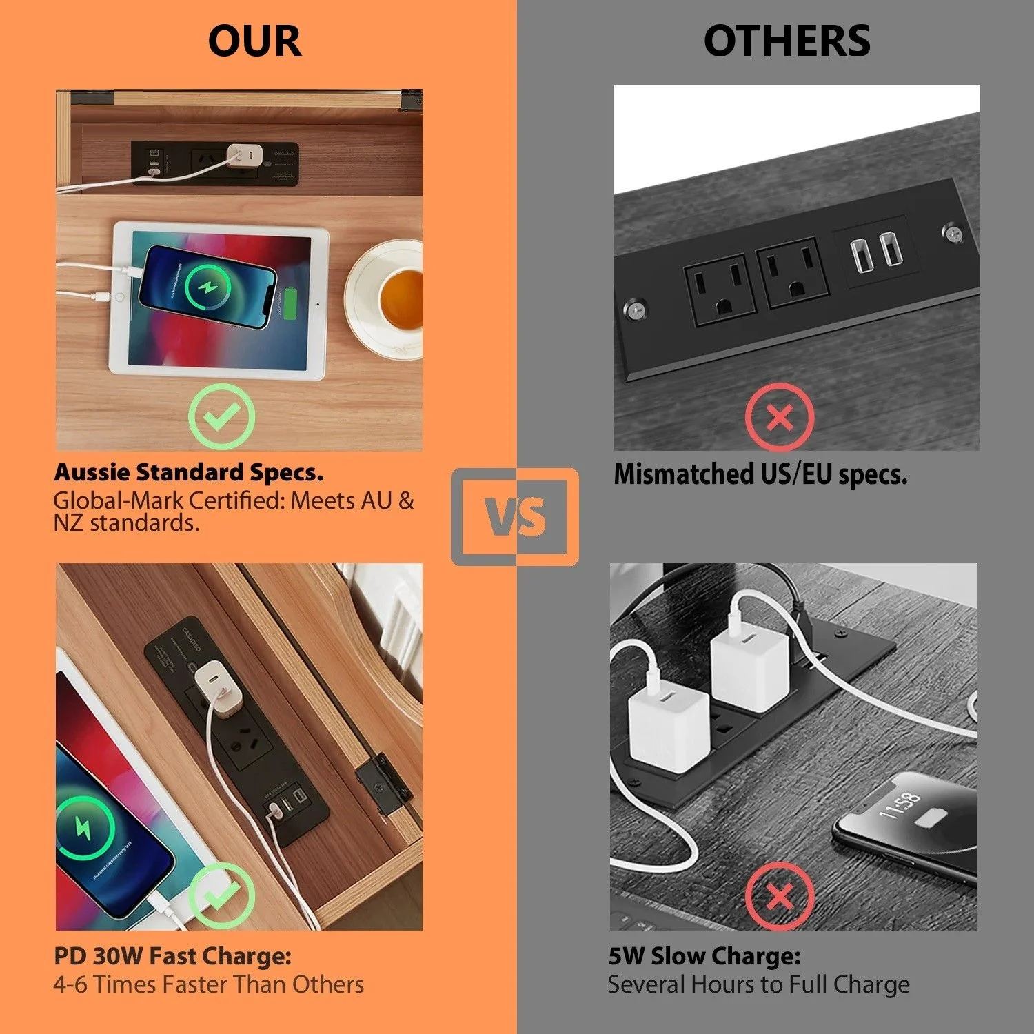 - Enjoy secure, rapid charging with this side table! Certified with Australian Global-Mark electrical safety standards, it features PD30W, USB Type-C, and surge protection. Plus, its 1.78m flame-retardant cord is designed for everyday use, giving you peace of mind and reliability.