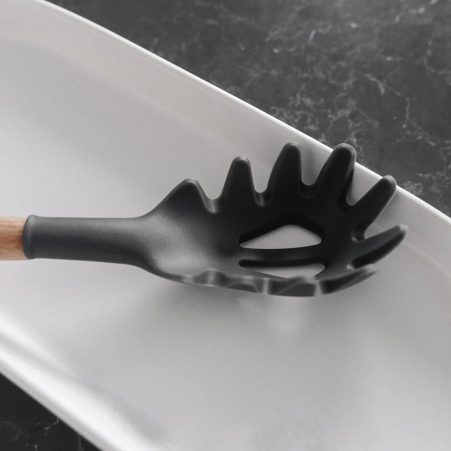 Our beautifully designed beechwood and silicone pasta server is a wonderful complement to any kitchenware collection. Made with sustainably sourced materials, it's ideal for your next dinner party or special occasion meal. Handwash only to maintain the beechwood's natural beauty.