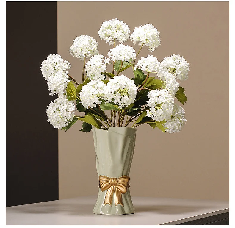 Elevate your home decor with this stunning ceramic vase, featuring a beautifully crafted golden bow accent. Its unique textured relief design, reminiscent of draped fabric, adds a touch of elegance and charm to any space. Perfect for displaying fresh bouquets, dried flowers, or standing alone as a sophisticated decorative piece.
