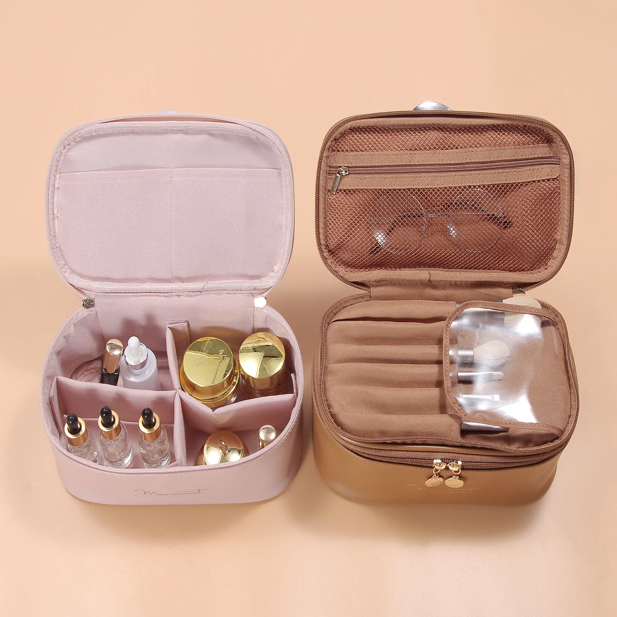 • Smart Organisation: The top layer includes dedicated brush holders with a protective flap and a zippered mesh pocket for smaller items like palettes or accessories. The spacious bottom layer can accommodate larger bottles, skincare products, and more, with internal pockets for further separation.