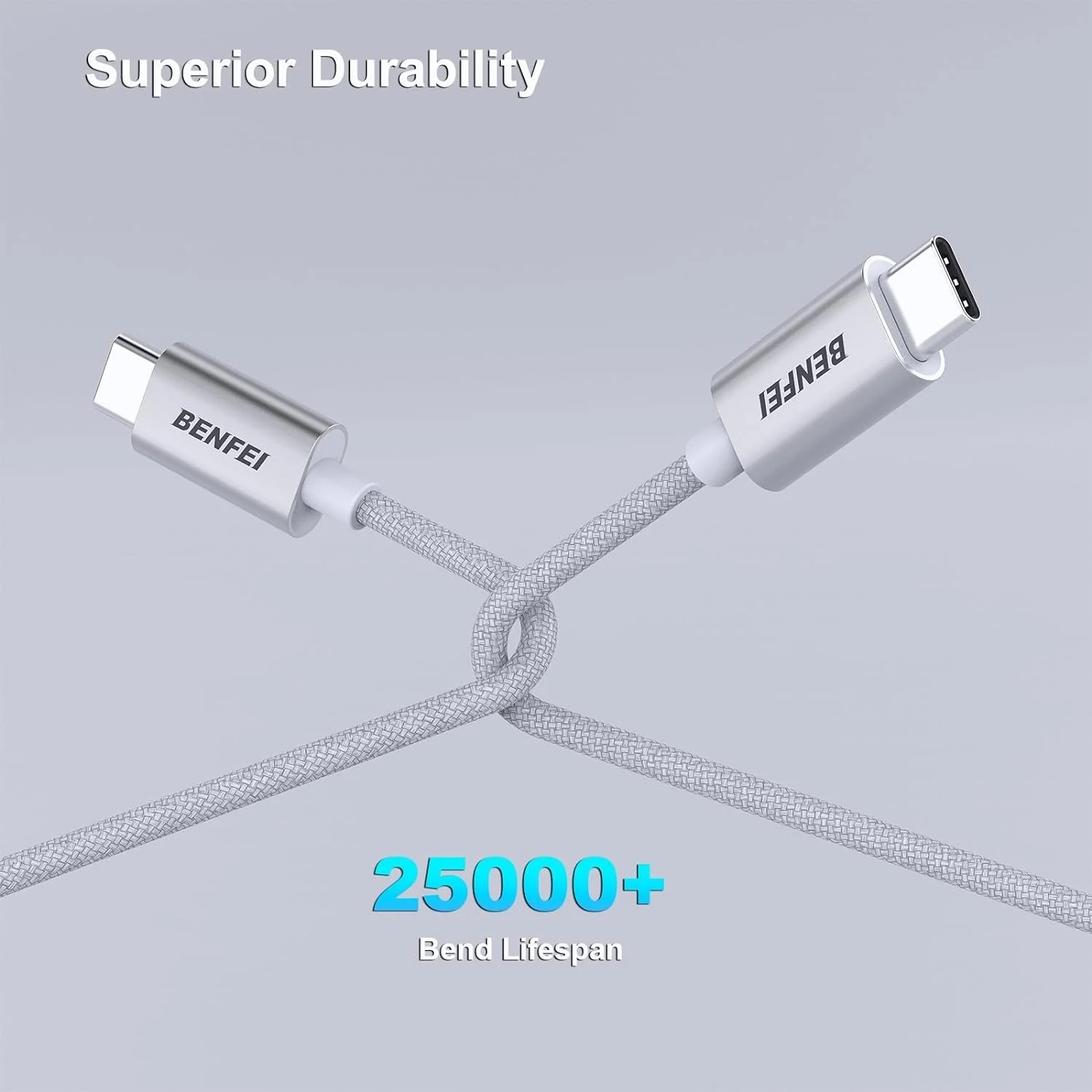 With 25,000-bend liftspan, BENFEI USB-C cable is not just soft, tangle-free, with solid and durability. Nylon braided cable jacket, no worries for fraying, heating, kinking.Streamlined metal pieces seamlessly connected, shock-proof.