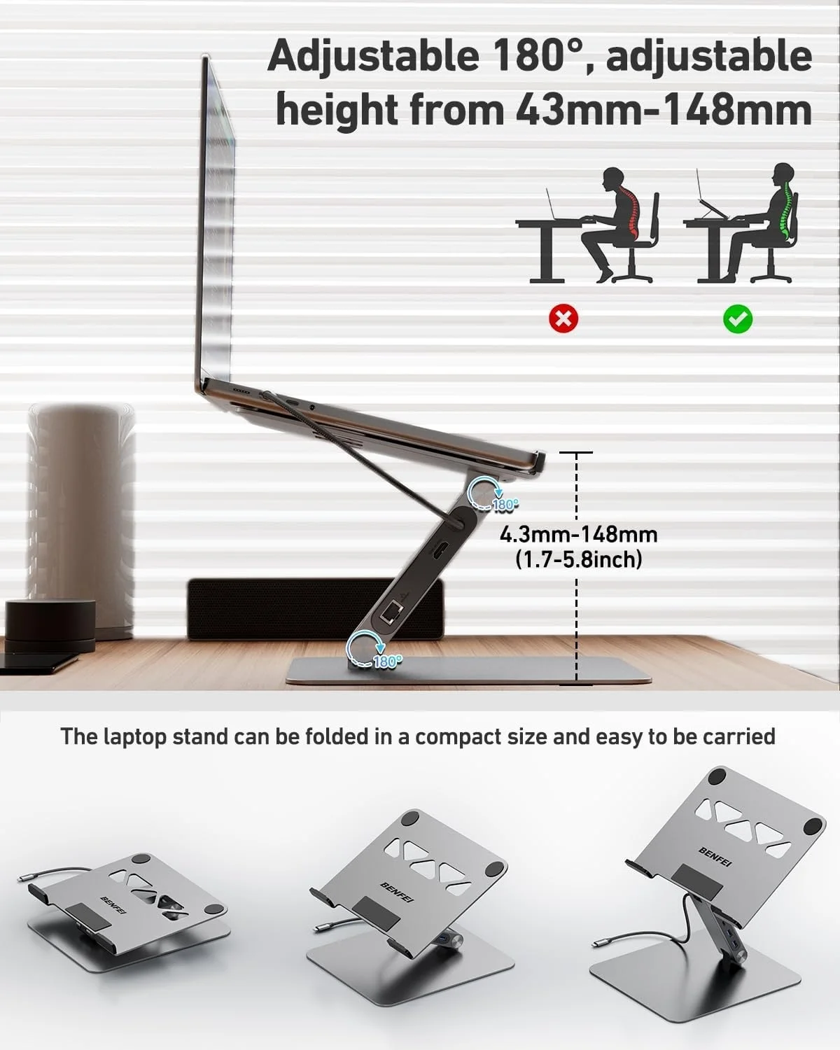 The BENFEI laptop stand offers adjustable height and angle for optimal comfort and productivity. Height adjusts from 68mm to 178mm and supports laptops up to 4.5kg. Product dimensions: 25024053.3mm.