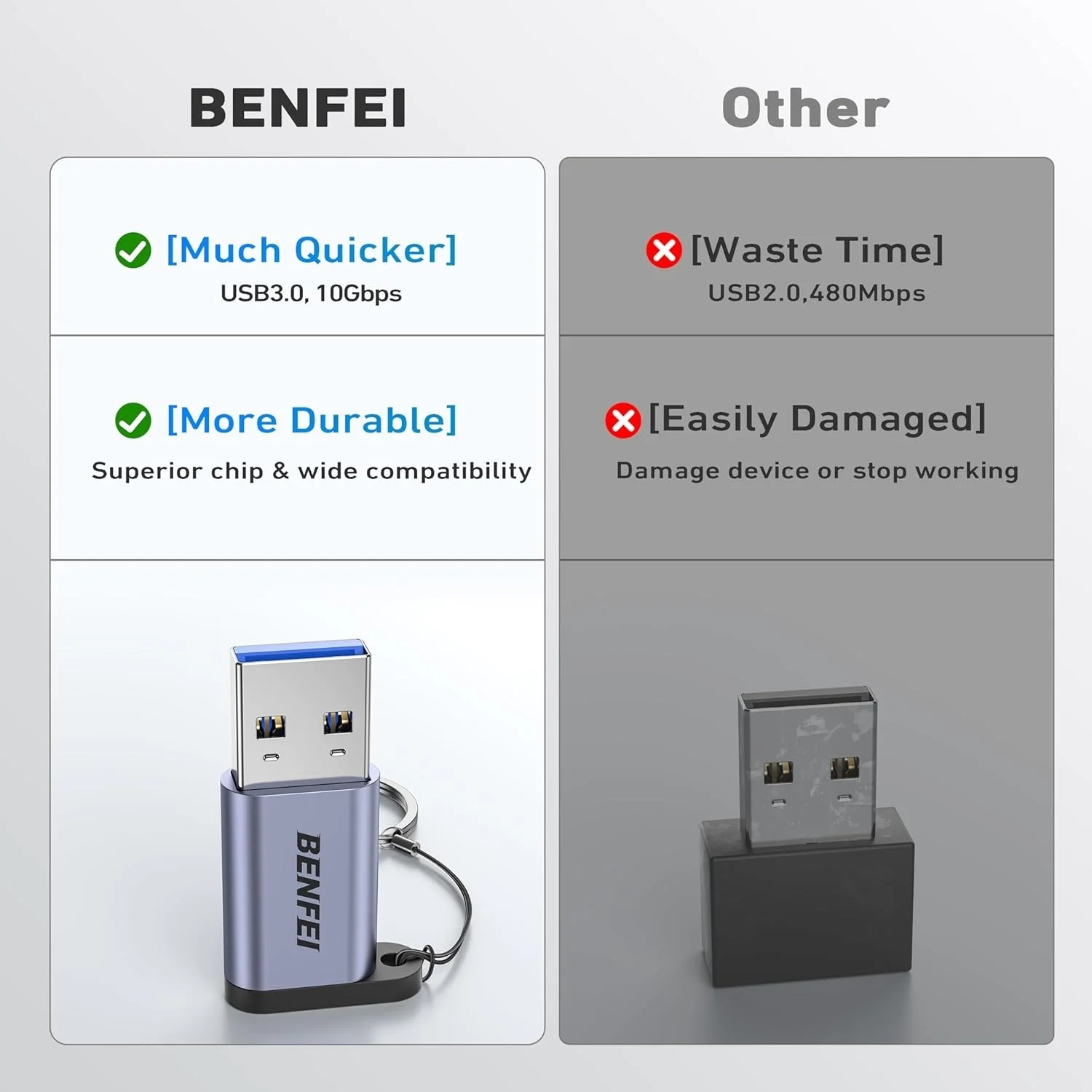 Built with BENFEI's in-house PCBA and automated assembly process using advanced SMT (Surface Mount Technology), this ultra-compact adapter features a convenient keychain design, making it ideal for laptops, tablets, smartphones, data transfers, and charging on the go.