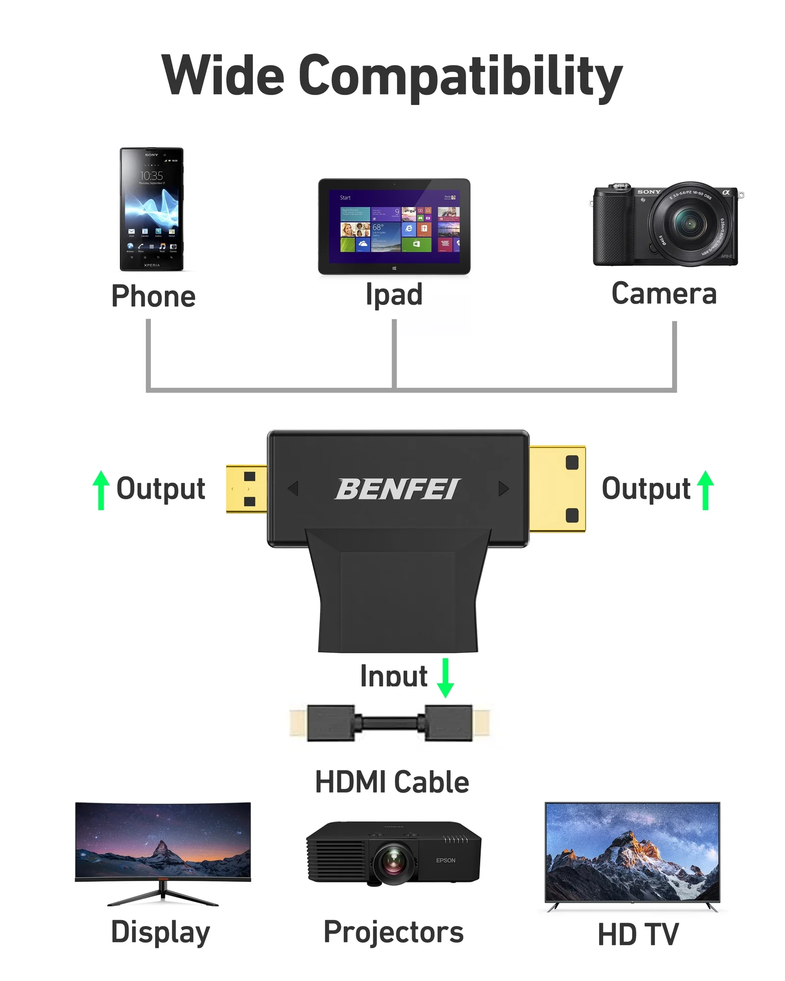 Works with any standard HDMI cable and is compatible with most devices featuring Mini or Micro HDMI ports, including tablets, smartphones, cameras, and laptops.