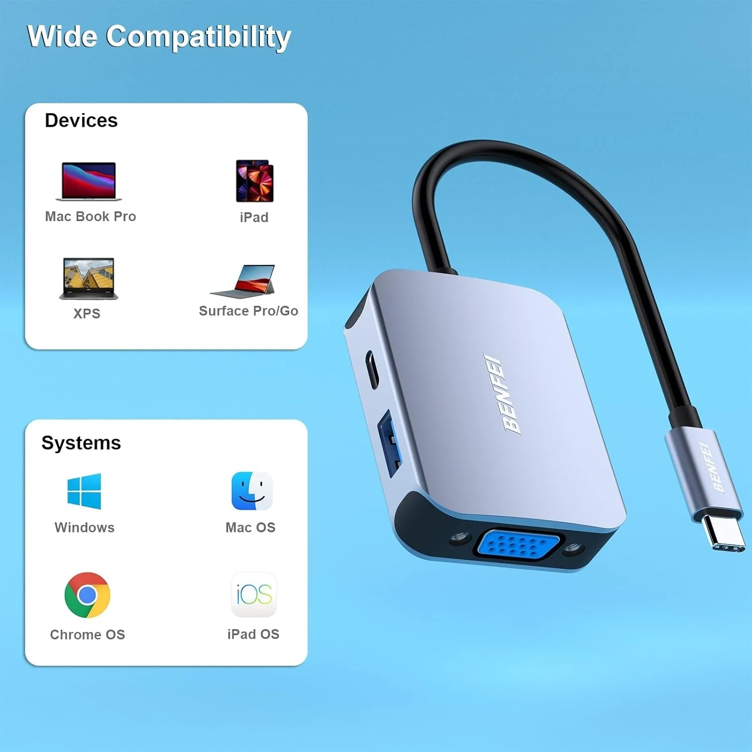 BENFEI USB Type-C to HDMI+USB+VGA adapter add 1 HDMI port, 1 VGA port and 1 USB-A ports to your USB-C laptop all from a single USB-C port. Tuck this lightweight gadget into your bag or pocket to do a business presentation with your laptop and projector, or extend your desktop screen to a monitor or TV;