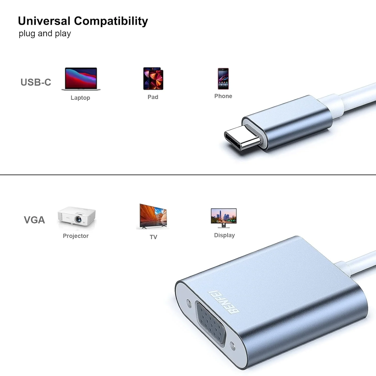 The compact-designed portable Benfei USB-C to VGA adapter connects a computer, desktop, laptop, or other devices with USB-C port to a monitor, projector, HDTV, or other devices with VGA port; Tuck this lightweight gadget into your bag or pocket to do a business presentation with your laptop and projector, or extend your desktop screen to a monitor or TV; A VGA cable is required.