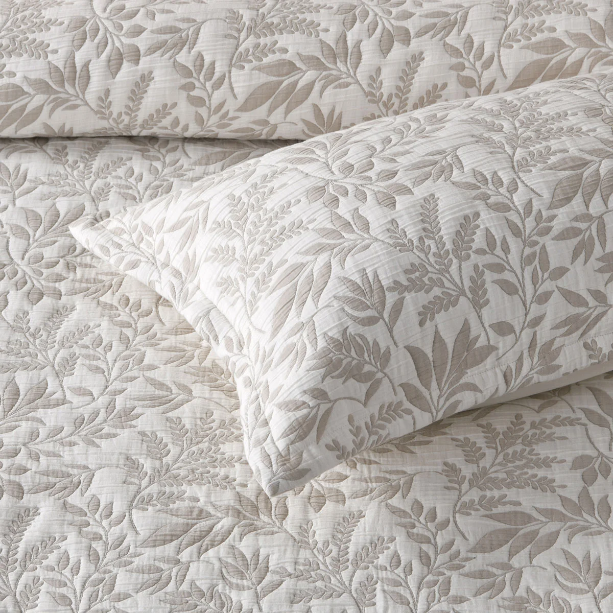 Delicate foliage in a soft stone and white colour way completely encompasses the entire bed. This stunning jacquard design pops on a crisp white background. Finished with a classy cuffed edge, Ameila Stone Jacquard Quilted Foliage Bedspread Set by Bianca is the perfect bedspread for your home. Complete the look with matching accessories.