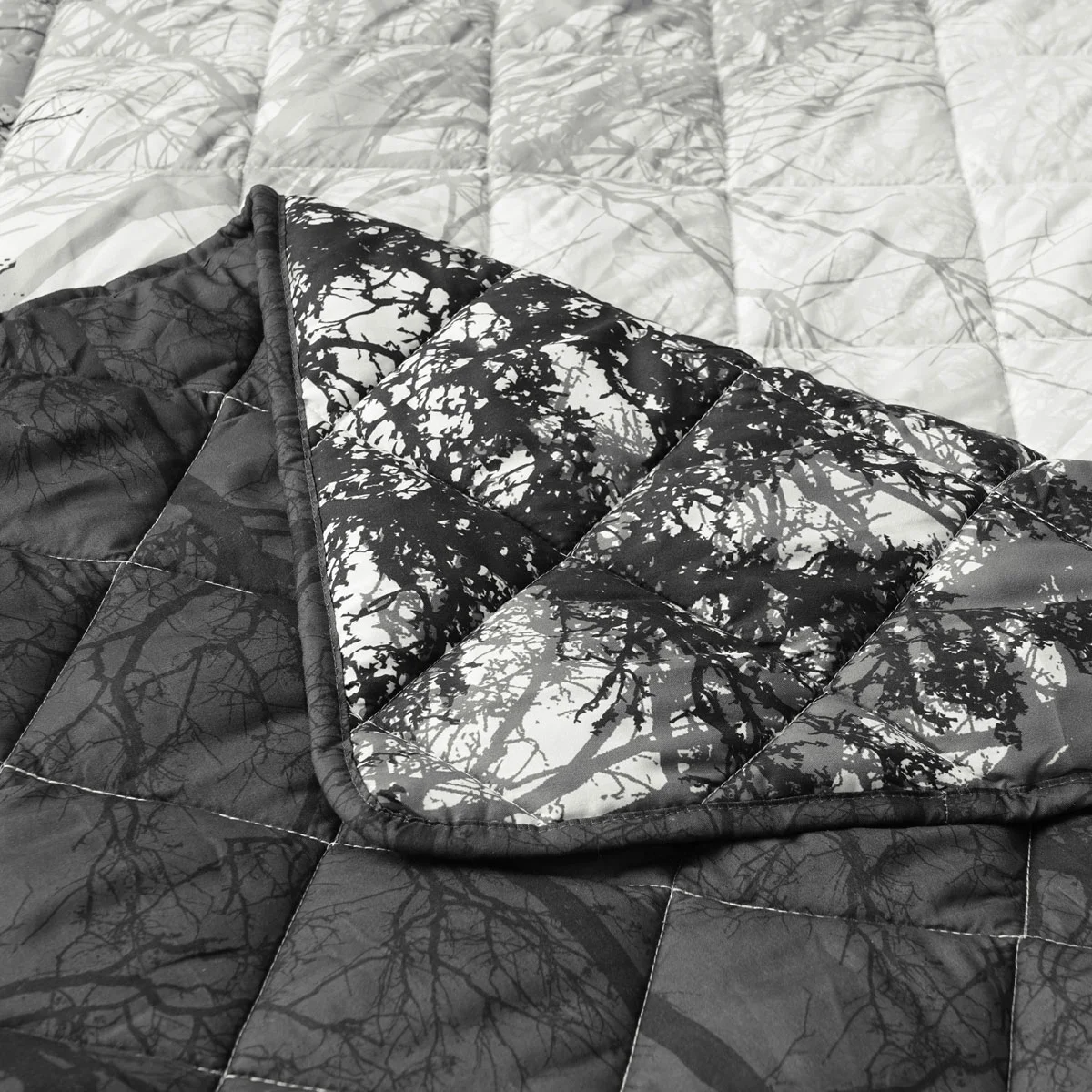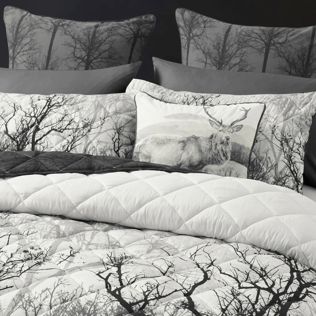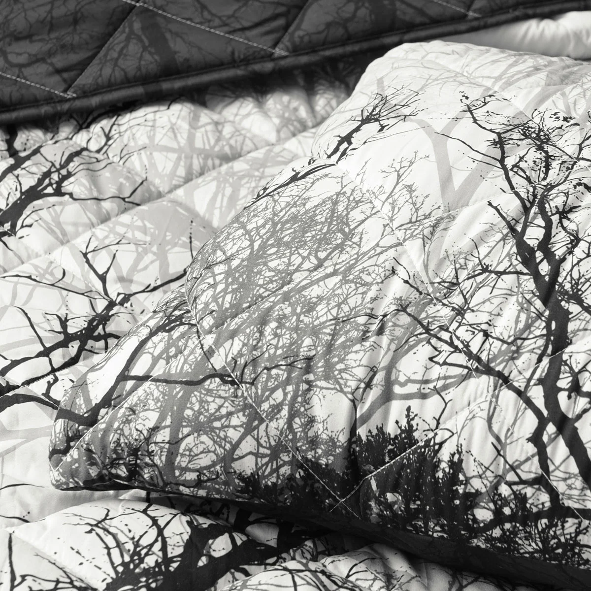 A mystifying forest. Making you want to dive deeper in and amongst the trees. Boscage Black Forest Printed Quilted Polyester Coverlet Set by Bianca adds a touch of sophistication with beautiful neutral tones of black, white, and grey hues and a contrasting black reverse. A classy diamond quilting pattern elevates this design.