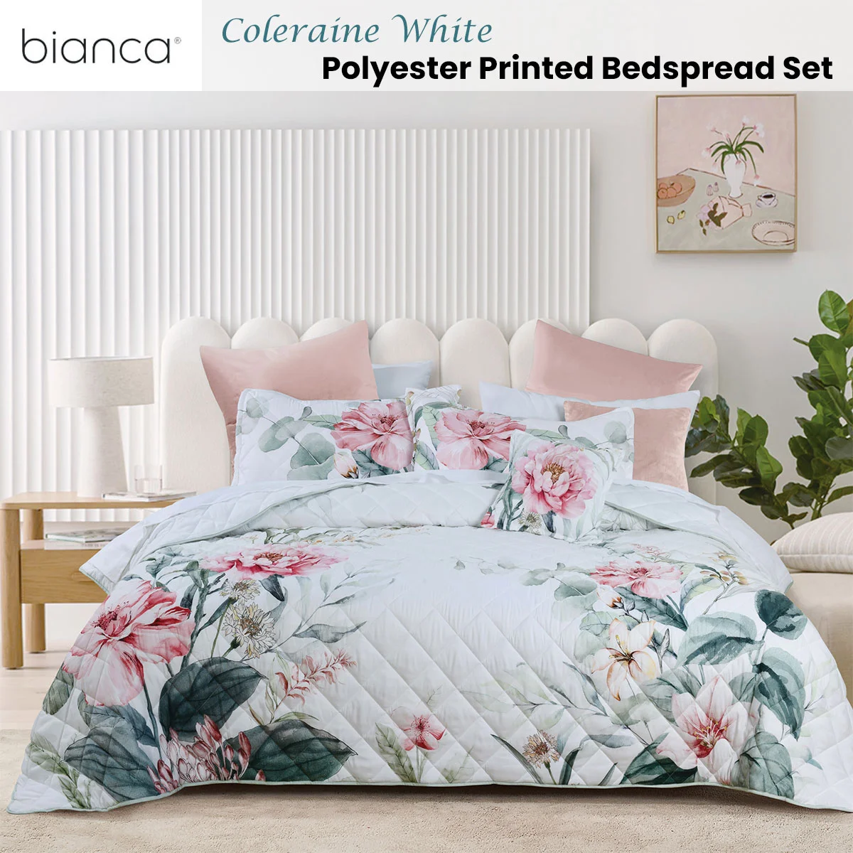 Elevate your bedroom with serene sophistication. This Bianca Coleraine White Floral Printed Bedspread Set features a soothing palette of soft white, taupe, pink, grey, brown, red, yellow, green, and blue. Made from quilted fabric for all-night comfort and finished with a tailored edge on the standard pillowcases and cushion for a refined, polished touch.