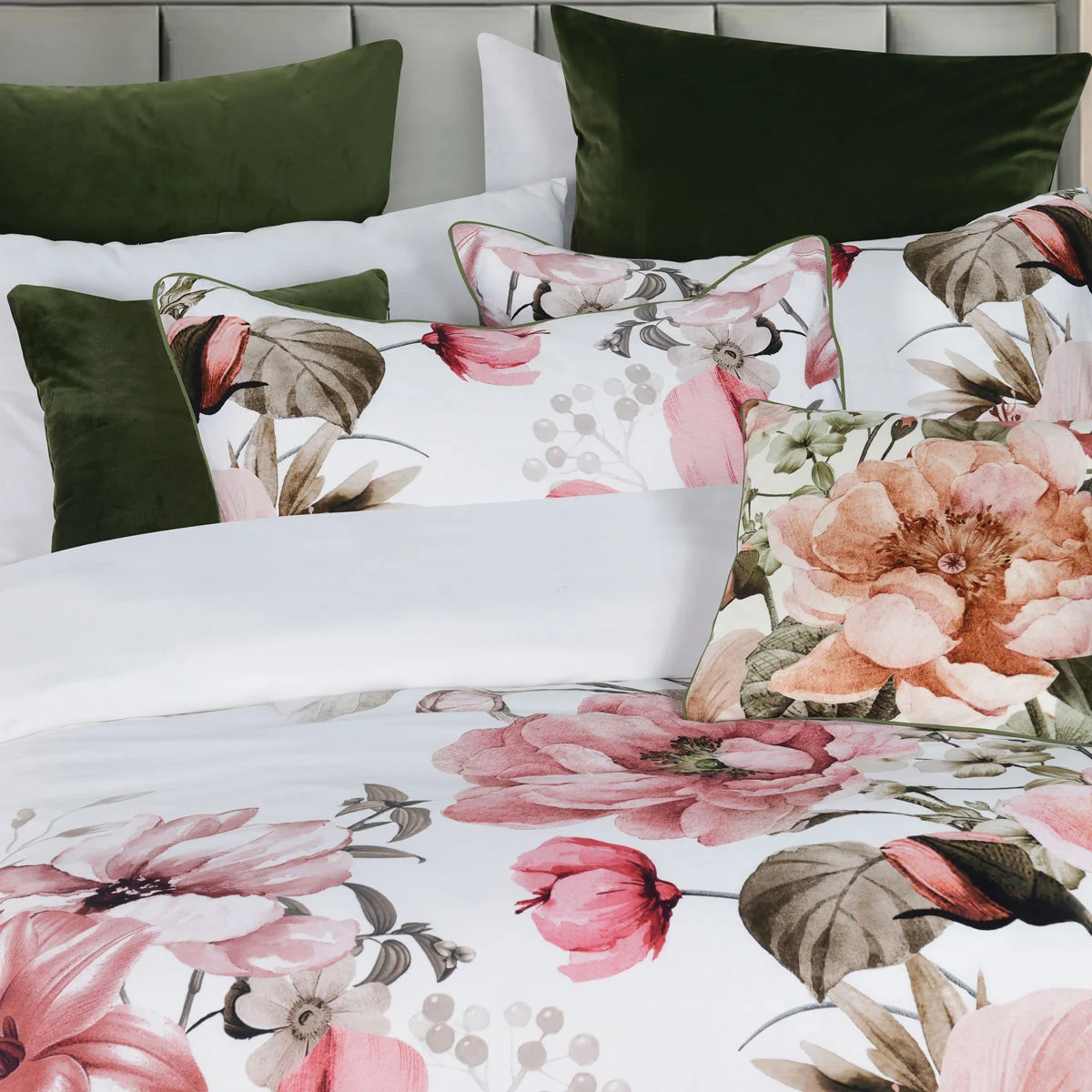 Eliana White Floral Printed Cotton Sateen Quilt Cover Set by Bianca, an exclusively designed panel print by our Australian designers. Exquisite pink hues have been carefully selected when marrying all the florals together printed in white, green, black, grey, pink, burgundy, and brown colour hues. Printed on super soft cotton sateen and finished with a gorgeous green piped edge. Complement the look with the square floral cushion.