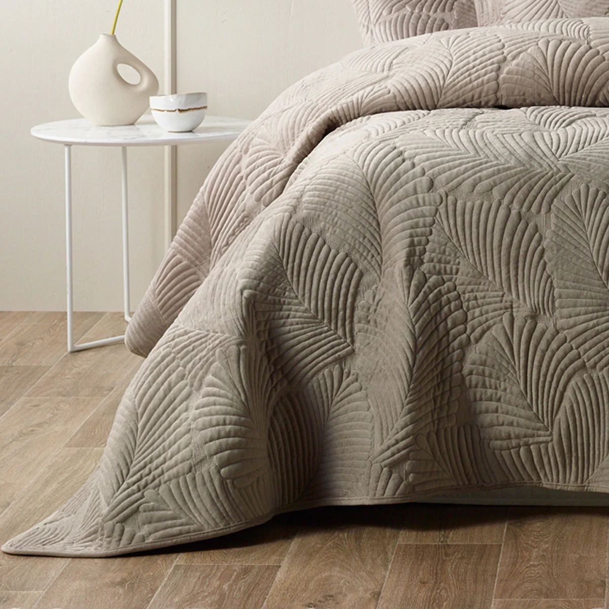 Made from super soft velvet fabric, Kairo Taupe Velvet Coverlet Set by Bianca features a quilted leaf design in stunning taupe. The neutral colour palette of this coverlet ensures that it will go in any bedroom within your home. The pillowcases and cushion feature an elegant tailored edge.