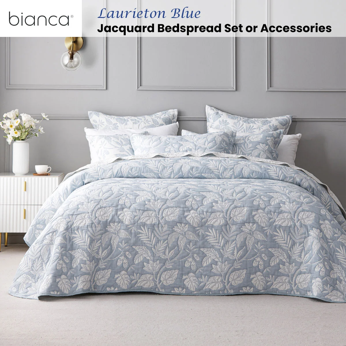 Give your bedroom the lift it needs with this stunning botanical inspired bedspread. The Bianca Laurieton Blue Jacquard Botanical Bedspread Set features a white jacquard leaf design that contrasts beautifully on a blue crisp background. The pillowcases and cushion are finished with a tailored edge. Add the coordinate european pillowcases and cushion to complete the look.