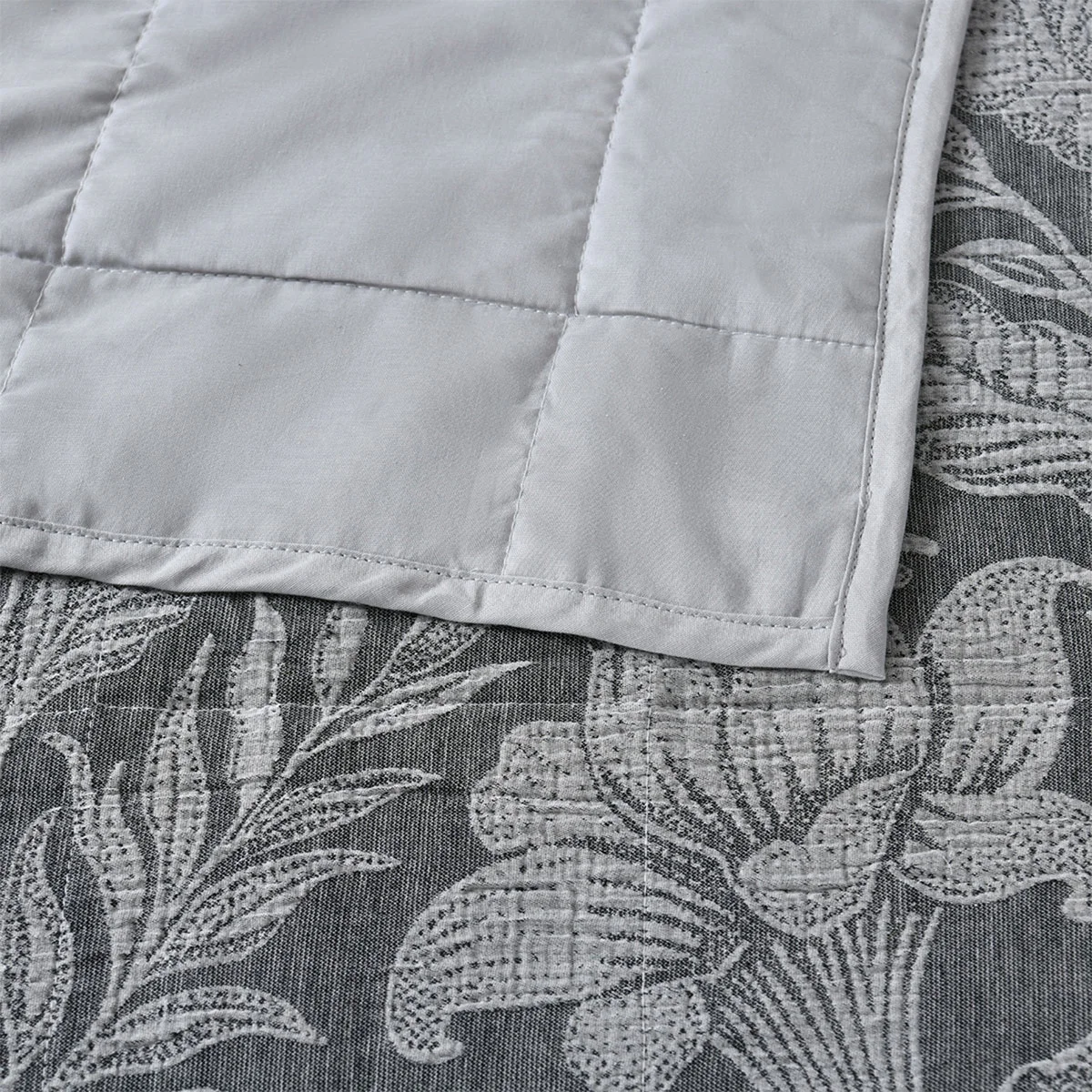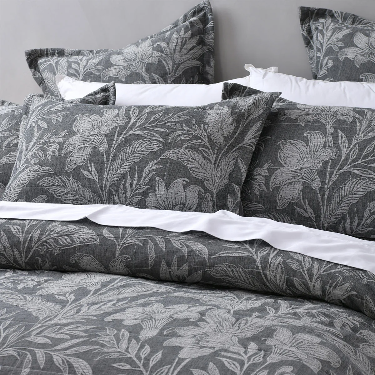 Refined florals with timeless texture. The Bianca Maidstone Grey Floral Jacquard Bedspread Set set features elegant light grey blooms set against a rich dark charcoal cotton jacquard. Thoughtfully finished with a tailored edge on the standard and European pillowcases, as well as the cushion it brings a polished, luxurious feel to your bedroom.
