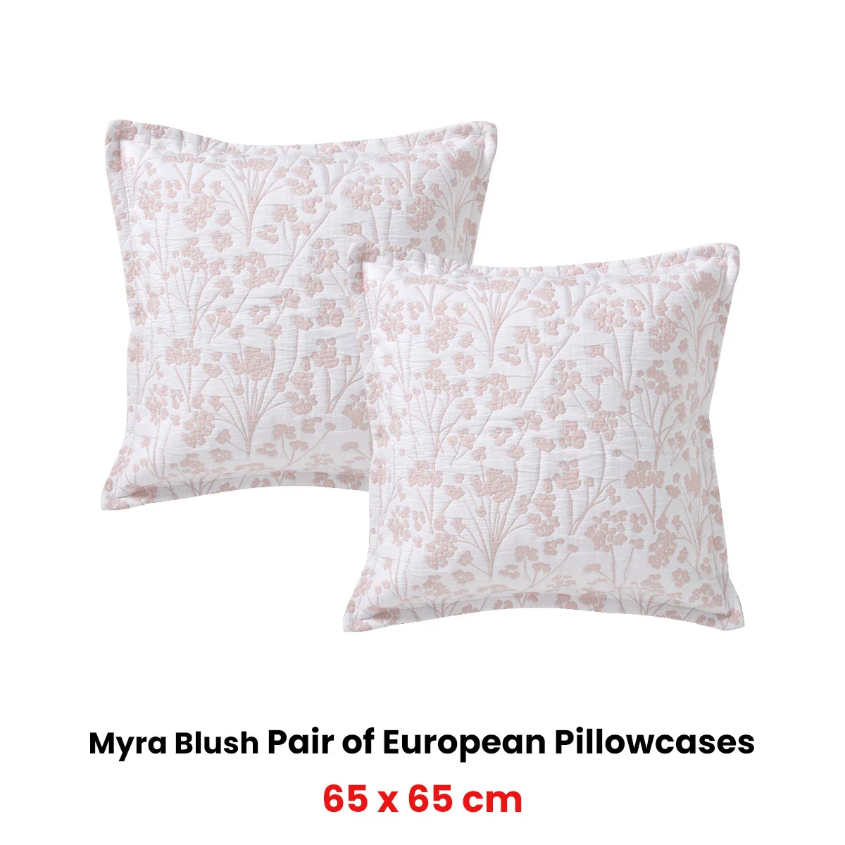 Delicate charm meets comforting softness with the Bianca Myra Blush Floral Jacquard Bedspread Set. Petite white florals are scattered across a gentle blush background, crafted in fabric that's soft to touch. Coordinating European pillowcases and cushions reverse the palette with blush florals on a white base, adding a subtle, graceful contrast to your bedroom styling.