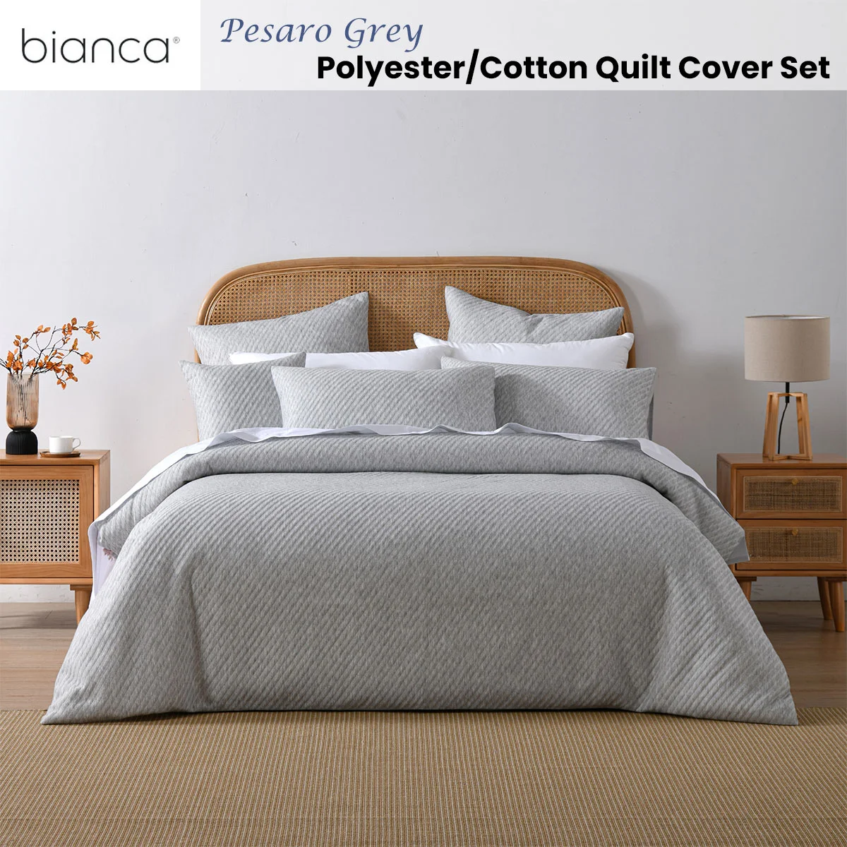 The Bianca Pesaro Grey Polyester Cotton Quilt Cover Set brings timeless simplicity and everyday comfort to your bedroom. Featuring a subtle diagonal pattern in soft grey, it offers a calm and contemporary aesthetic that's easy to style. Made from a durable polyester-cotton blend, this set balances softness with practicality, perfect for creating a neat, inviting, and effortlessly refined sleeping space.