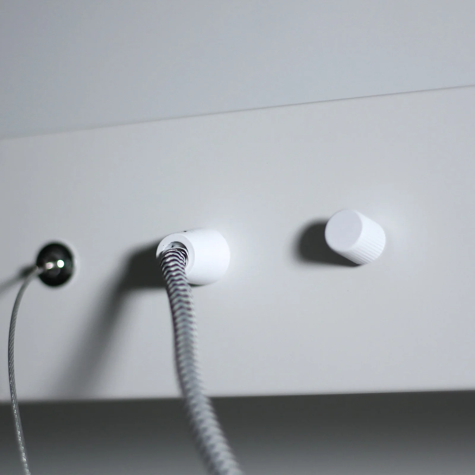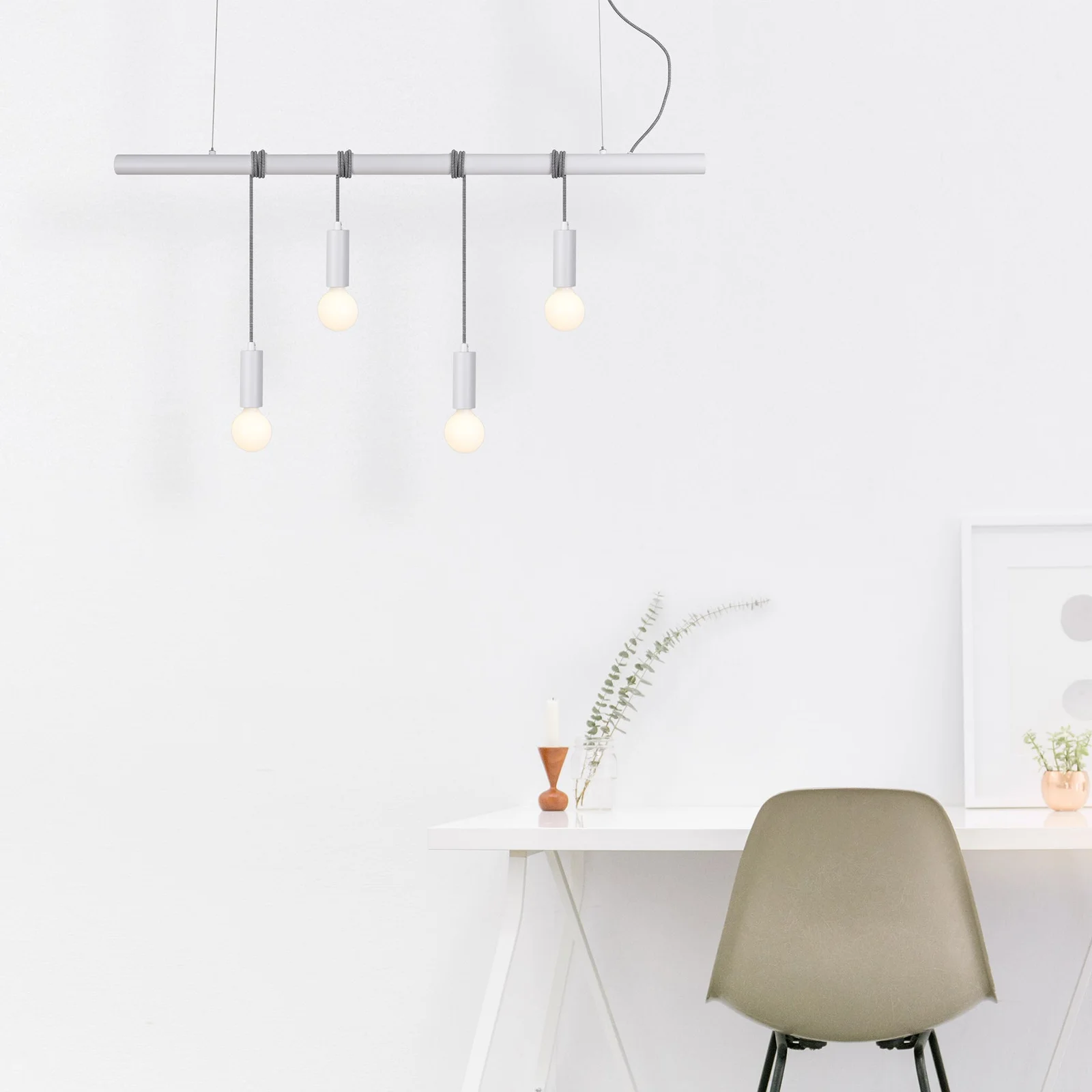 The four globe holders that drop from the lighting bar each have long grey braided cords that can be wrapped around the lighting bar to set heights individually. The heights can set to your preference, whether after a staggered look, or a short non-invasive drop, or a long, purposeful hang. The Bikkel Four Light Pendant comes in black and white and requires four E27 globes.