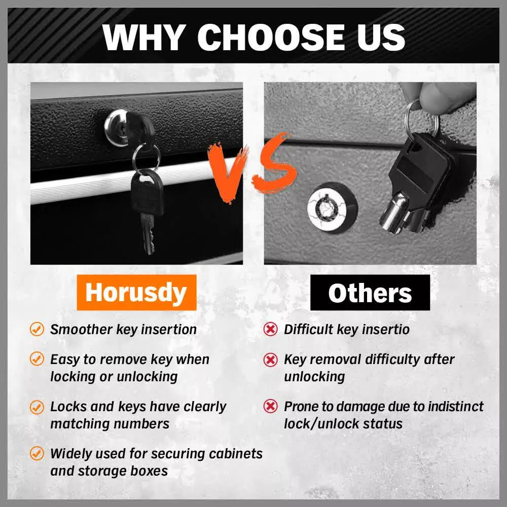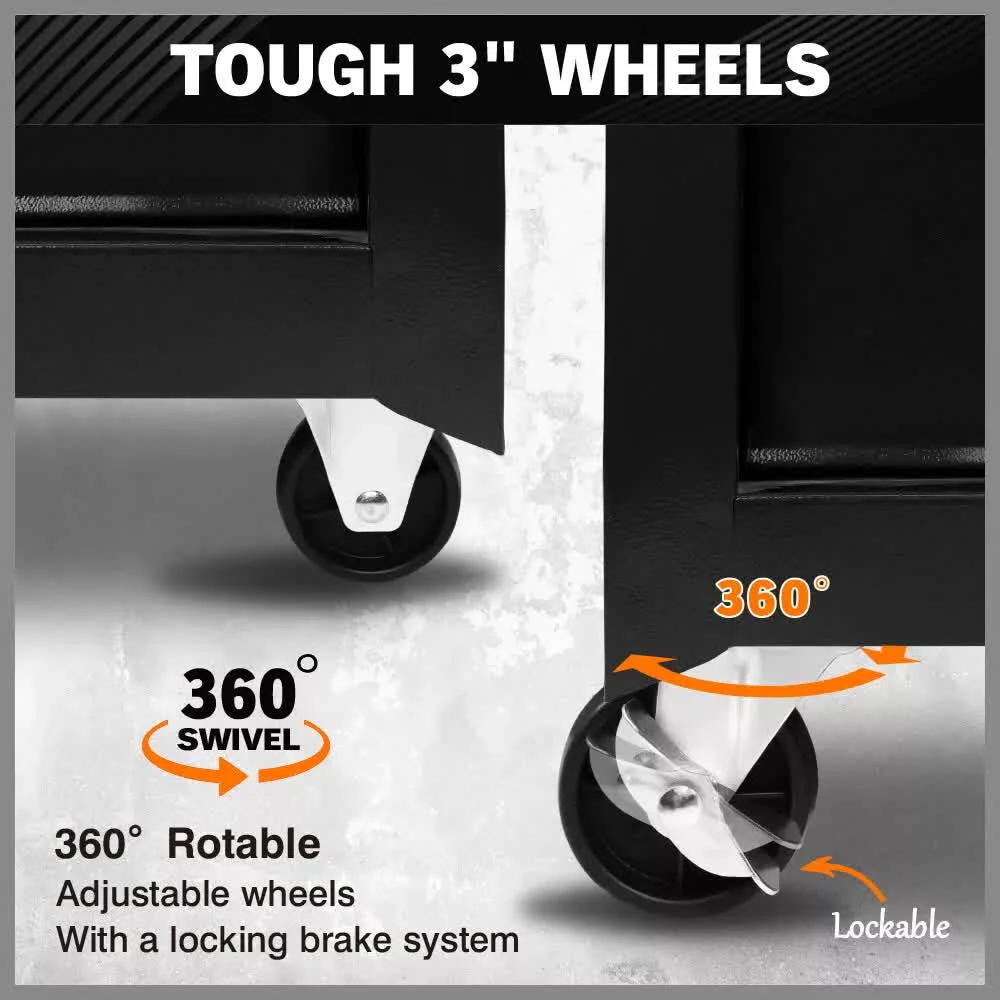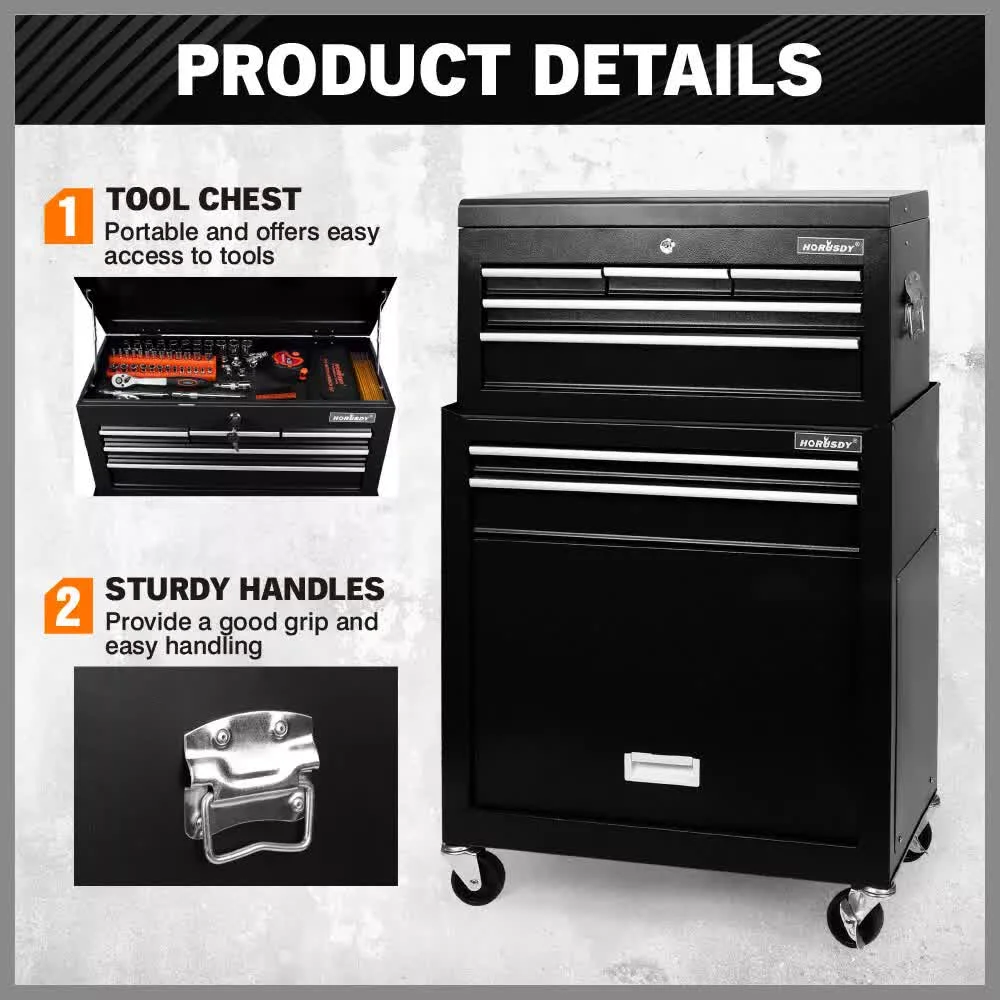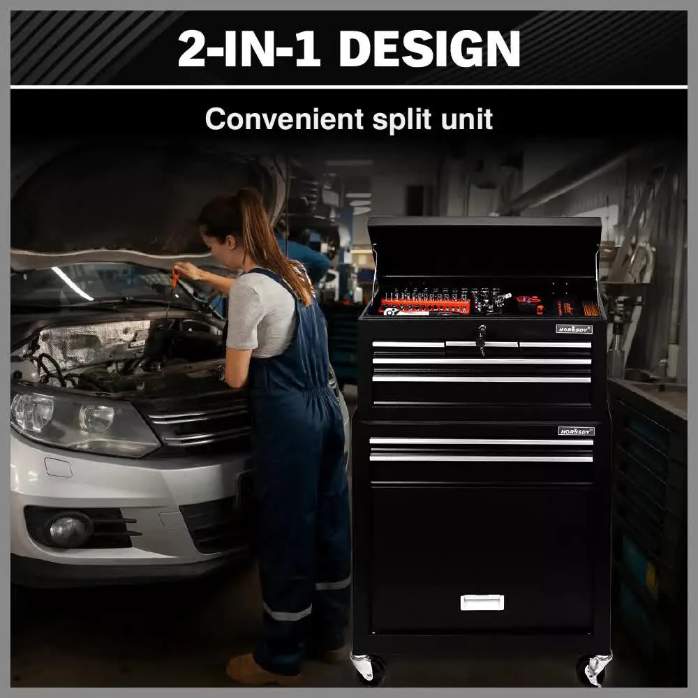 The HORUSDY 7-Drawer Tool Box Chest Cabinet is a versatile storage solution made of durable powder-coated steel. With its 2-in-1 detachable and combinable design, the upper and lower cabinets can be separated or combined as needed, saving space and enabling easy transportation. Each drawer features smooth ball-bearing slides and is lined with non-slip protective liners to keep your tools secure. The tool trolley is equipped with swivel castors, including 3" brake castors for easy maneuverability on slopes. It offers ample storage space, sturdy construction, and premium cam locks with keys for added security.