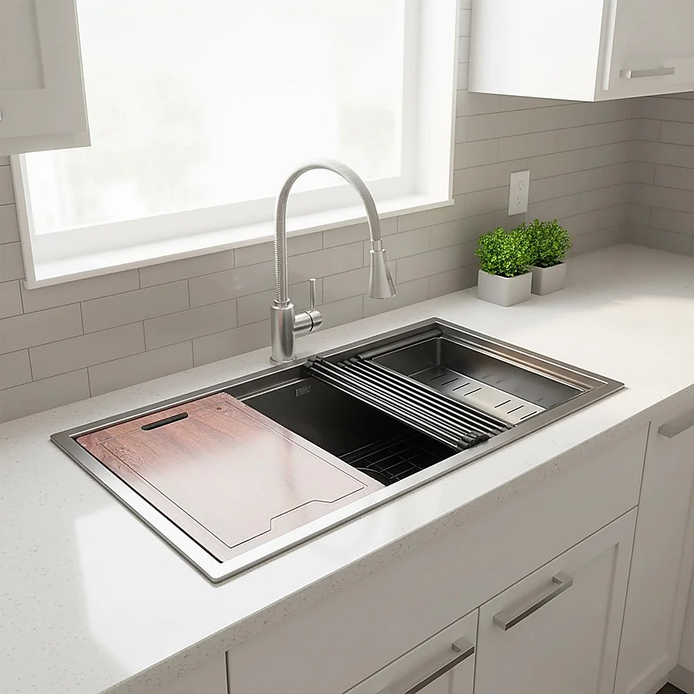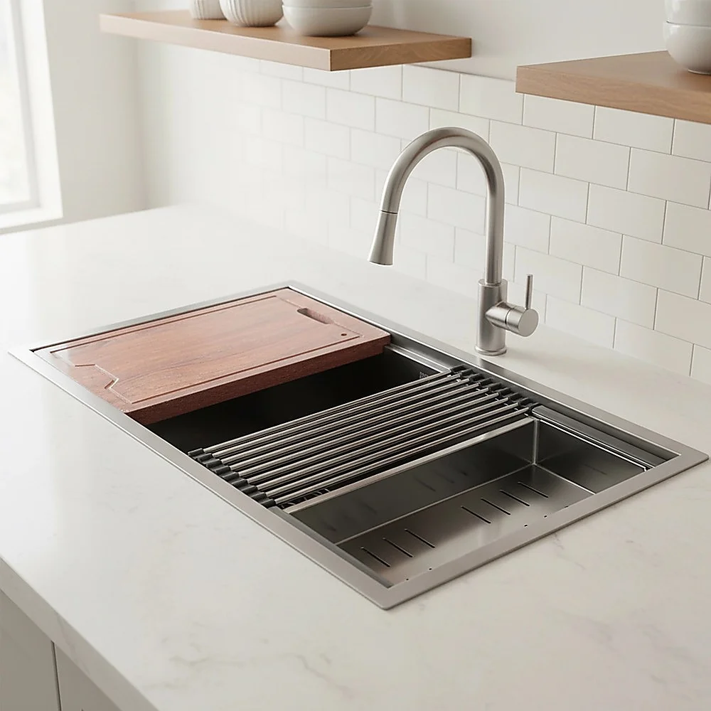 This WORKSTATION sink from BRIENZ maximizes the functionality of your kitchen sink by adding built-in accessories that slide on integrated ledges built into the sink. Includes a deep STAINLESS STEEL COLANDER that you can also use as a caddy for your dish soap and sponge. The solid CUTTING BOARD is constructed of luxurious hardwood that has a beautiful dark finish. The sturdy stainless steel FOLDABLE RACK sits on the track and is ideal as a dish drying rack.