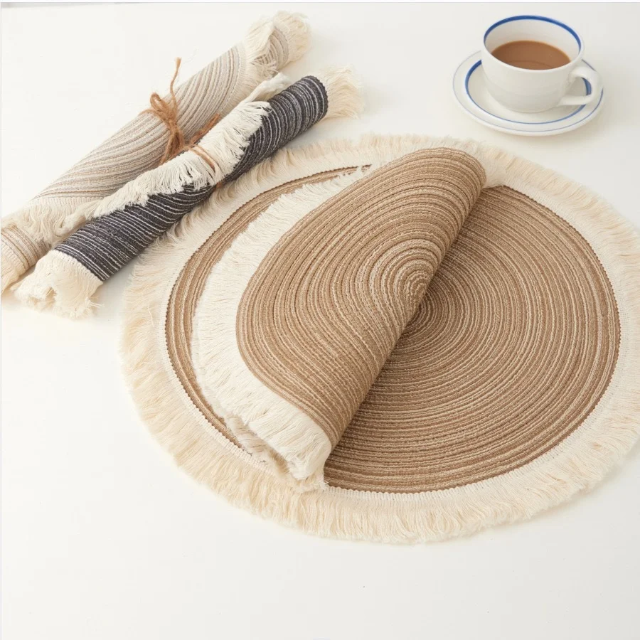 Elevate your dining experience with this beautiful set of four round woven placemats. Featuring a charming tassel fringe, these mats bring a touch of bohemian chic and rustic warmth to any table setting. Perfect for everyday meals, special occasions, or as decorative accents under vases and centrepieces.